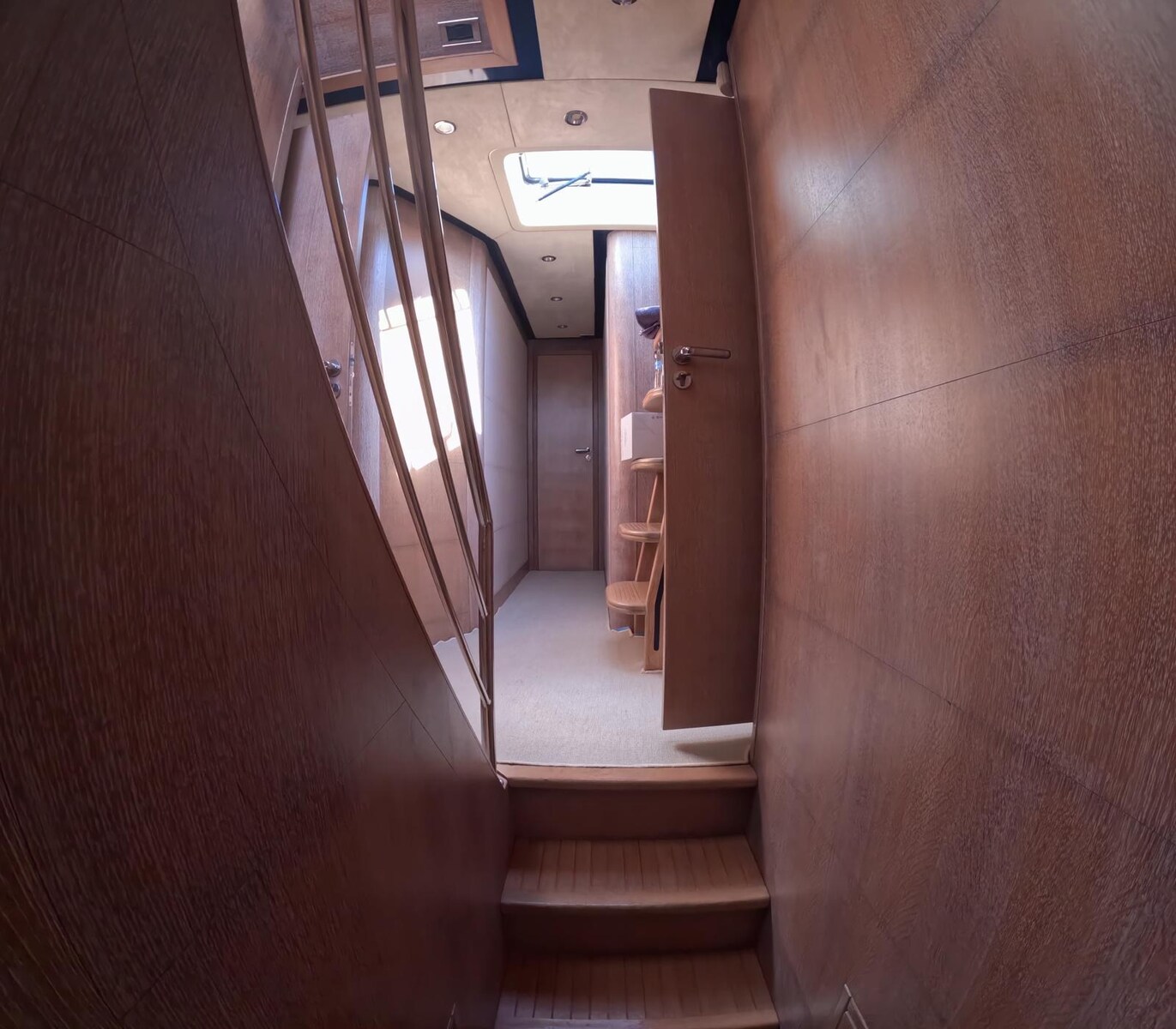 Livré à son premier et unique propriétaire, en avril 1999, ce Follia 75 d’AB Yachts est un grand et rapide yacht de sport avec propulsion Hamilton Jet et combine les normes les plus élevées en matière d’accastillage et de finitions avec une excellente maniabilité et navigabilité. Le Follia 75 est une mise à jour des conceptions précédentes, avec des moteurs plus puissants et une coque en V profond pour offrir une navigation en mer plus rapide et plus confortable. Deux moteurs Deutz de 1850 ch chacun fournissent la puissance impressionnante aux jets d’eau via des boîtes de vitesses Twin Disc. Le bateau est construit avec de la mousse à cellules fermées entre des couches de composite. Il y a une couche d’élastomère à l’intérieur du stratifié, qui maintient l’étanchéité même si le stratifié est endommagé lors d’une collision. Les ponts sont en nid d’abeille en aluminium. Cette construction rend le Follia 75 très léger mais aussi très durable. Deux portes arrière permettent l’accès aux annexes. Une autre caractéristique du Follia 75 est son design futuriste dans son cockpit et ses commandes très intuitives. Le déflecteur de marche arrière et les manettes des gaz sont contrôlés à l’aide d’un seul levier et il y a trois régimes de ralenti au choix pour des manœuvres précises.