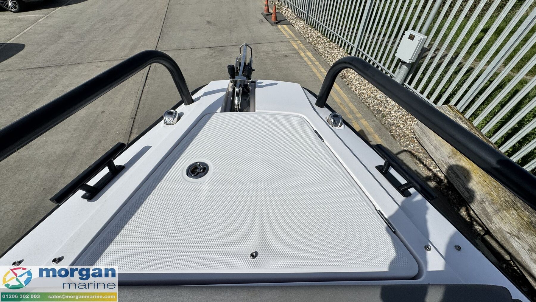 Deck: GRP deep Vee hull. Rubbing strake. Deck pop up shower. Swim platforms with Stainless Steel boarding ladder. Mooring cleats. Grab rails all round. Bow locker. Forward upper bow locker. Electric windlass with anchor, chain and rope - Control from bow and helm station. Bow roller. Non slip deck. A-frame with tow eye. Fenders and lines.