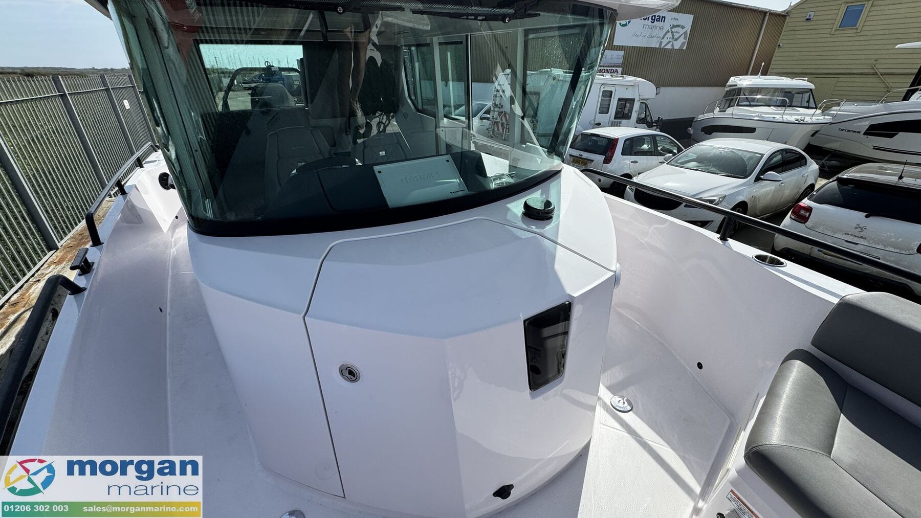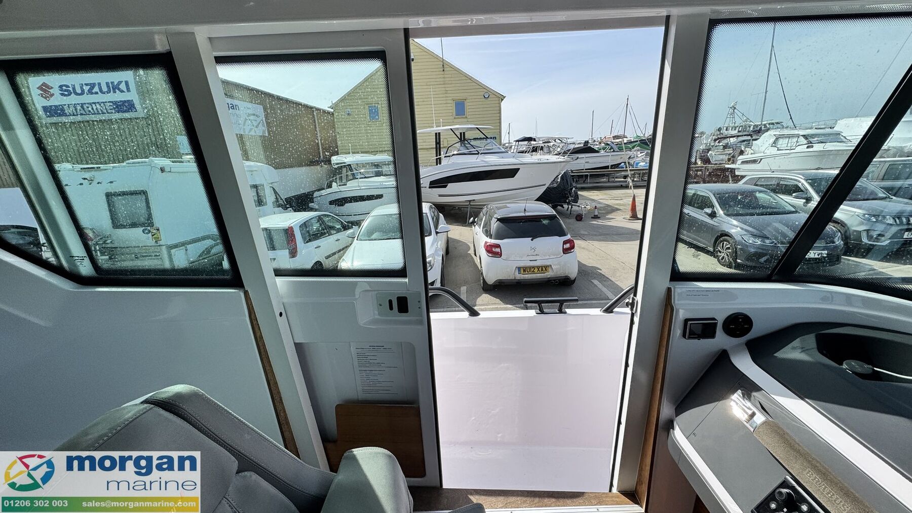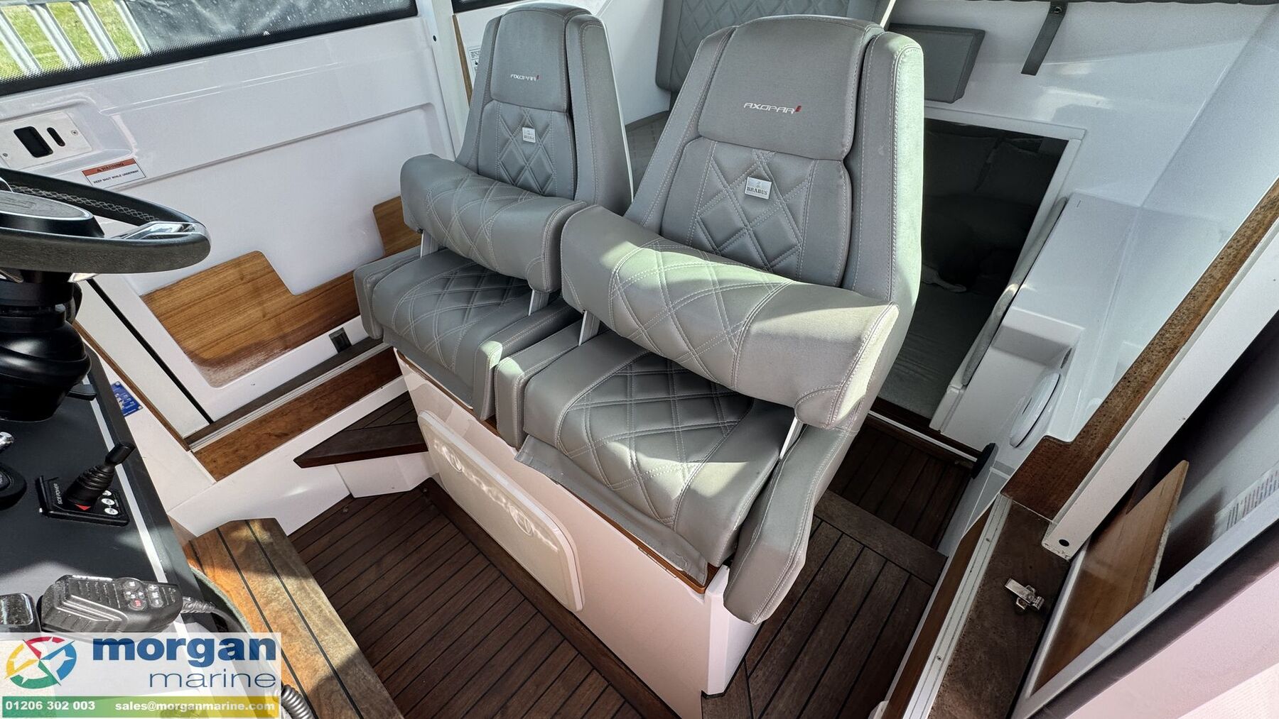 Cockpit: Port and Starboard side door access. Aft sun bed area with removeable sun bed cushions. Port and Starboard side lockers with storage. Deep side deck walk ways on either side of boat. Pilot and co pilot bolster seats which rotate and slide forwards and backwards. Console with dash, steering wheel, electronics, throttle control, and grab handle. Cup holders on console. Teak cabin table. Rear cabin bench seat with backrest. Bow L - shape sun bathing seating with removeable cushions with backrest and table with high and low legs. Infill cushion to make large bow sun bed area. Manual sliding roof with blind. Cup holders. Good amount off light from its wrap around windscreen. Bow and aft sun bed covers.
