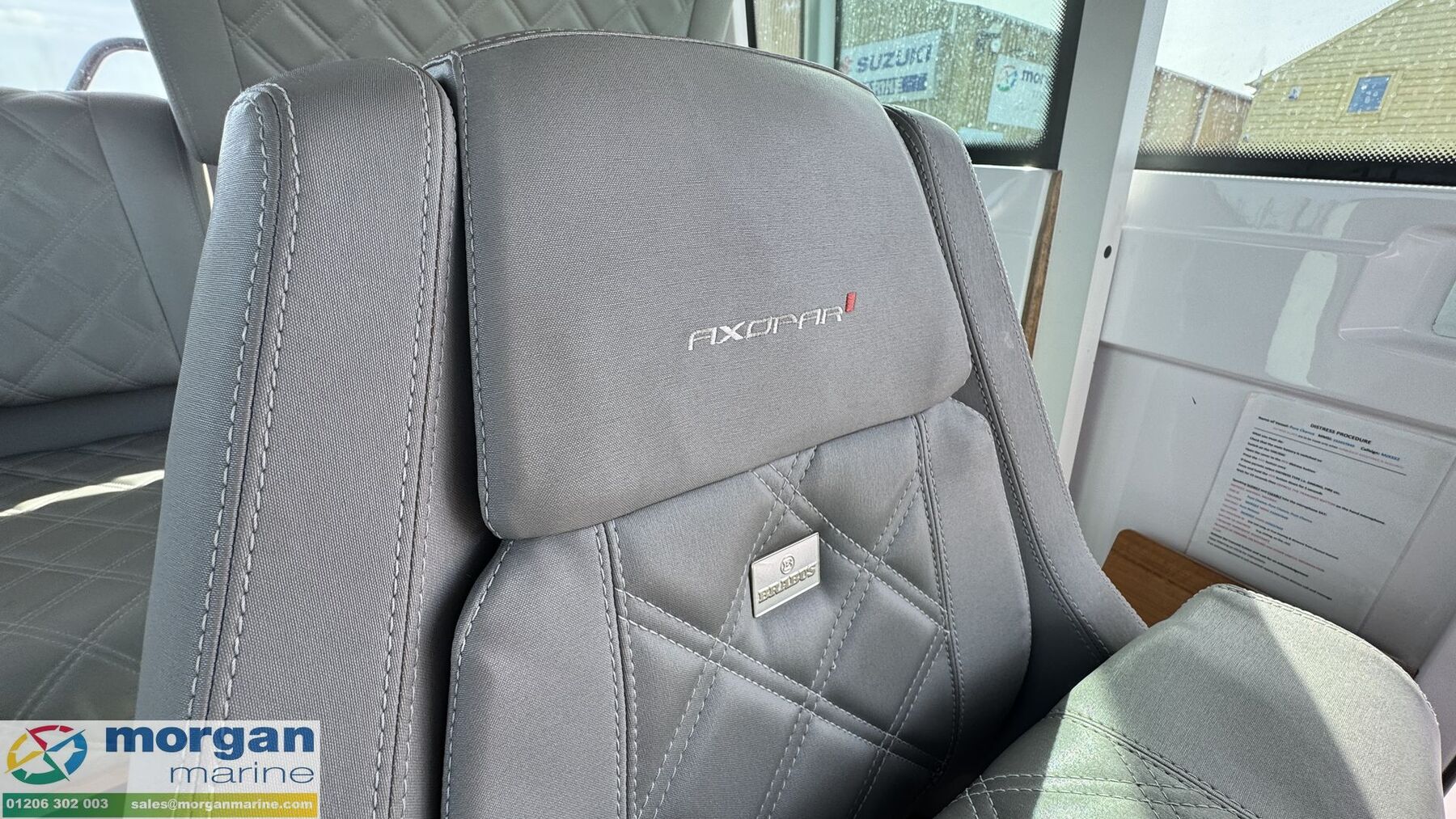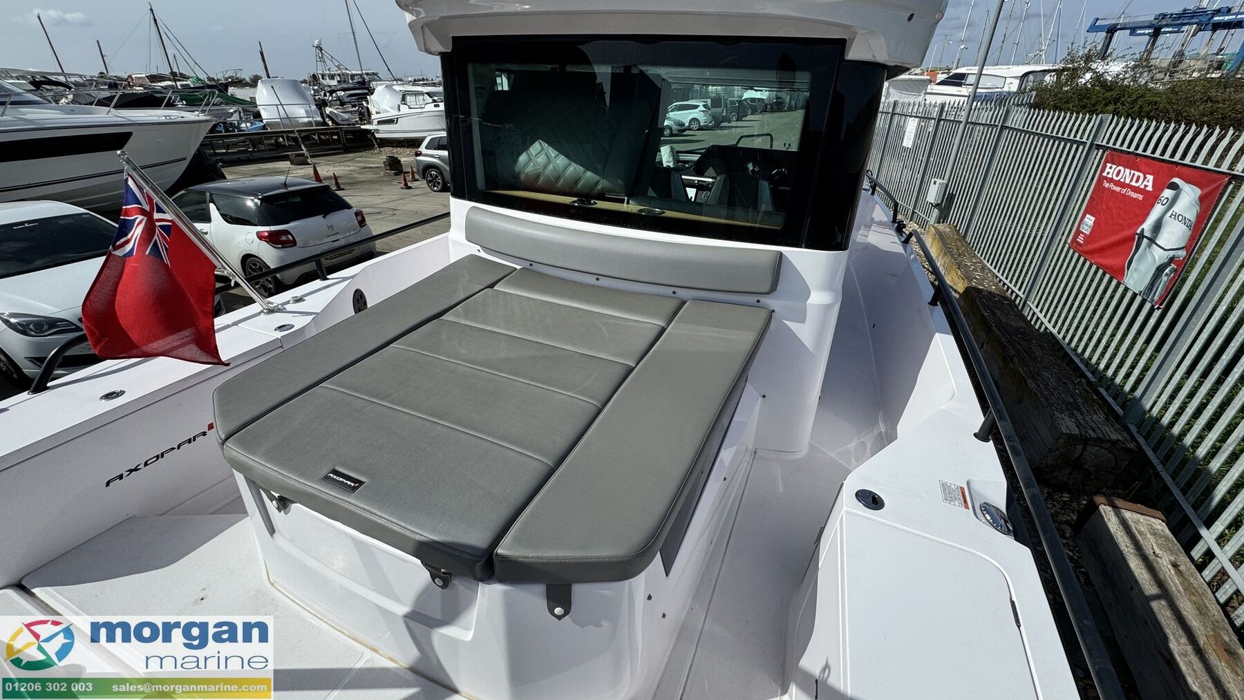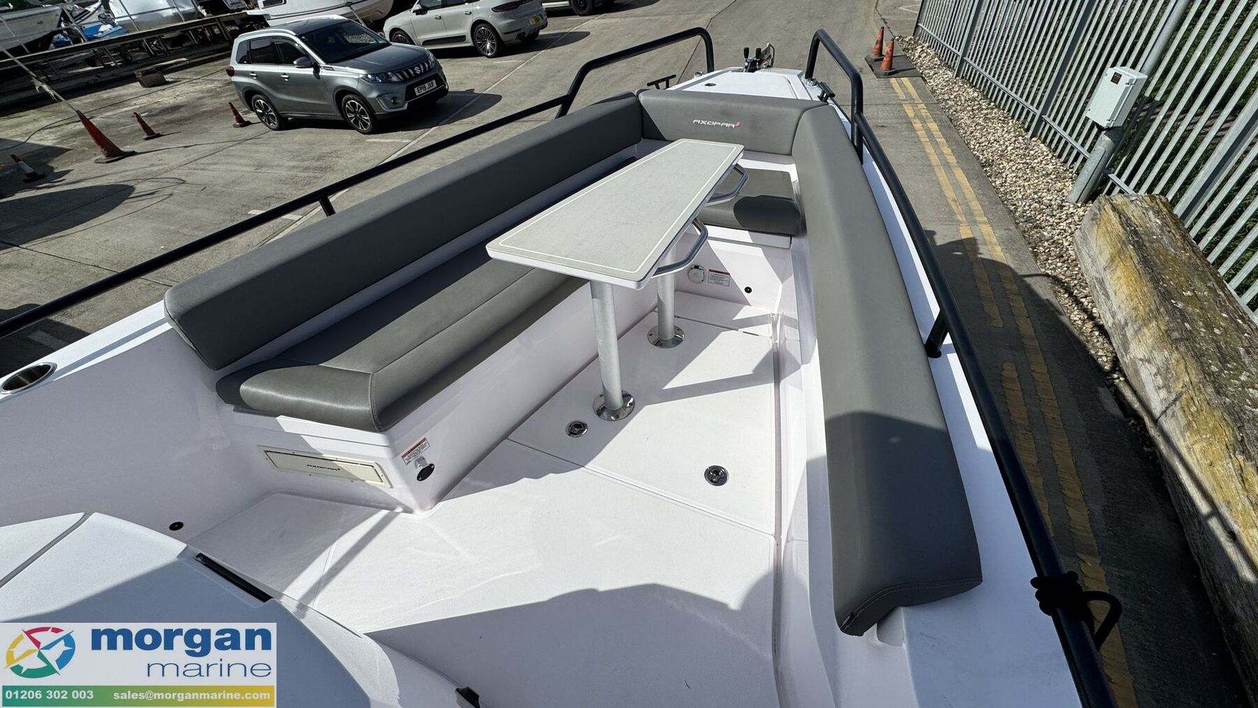 Cockpit: Port and Starboard side door access. Aft sun bed area with removeable sun bed cushions. Port and Starboard side lockers with storage. Deep side deck walk ways on either side of boat. Pilot and co pilot bolster seats which rotate and slide forwards and backwards. Console with dash, steering wheel, electronics, throttle control, and grab handle. Cup holders on console. Teak cabin table. Rear cabin bench seat with backrest. Bow L - shape sun bathing seating with removeable cushions with backrest and table with high and low legs. Infill cushion to make large bow sun bed area. Manual sliding roof with blind. Cup holders. Good amount off light from its wrap around windscreen. Bow and aft sun bed covers.
