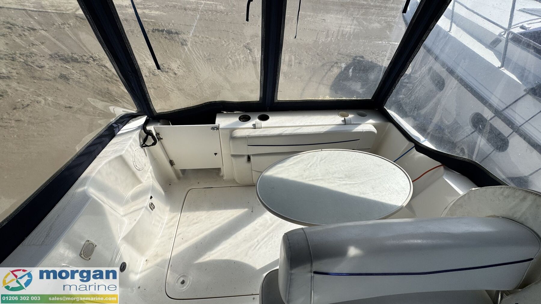 Cockpit: Large wrap around windscreen. Steps up to windscreen with walk through windscreen. Electric single windscreen wiper. Lift up hatch to saloon. Helm position to starboard side with engine controls, steering wheel and throttle controls. Danforth compass. Rear cockpit bench style cushioned seating with backrest. Cockpit port side L shaped sun lounger with flip backrest. Cockpit table. Lots of storage.