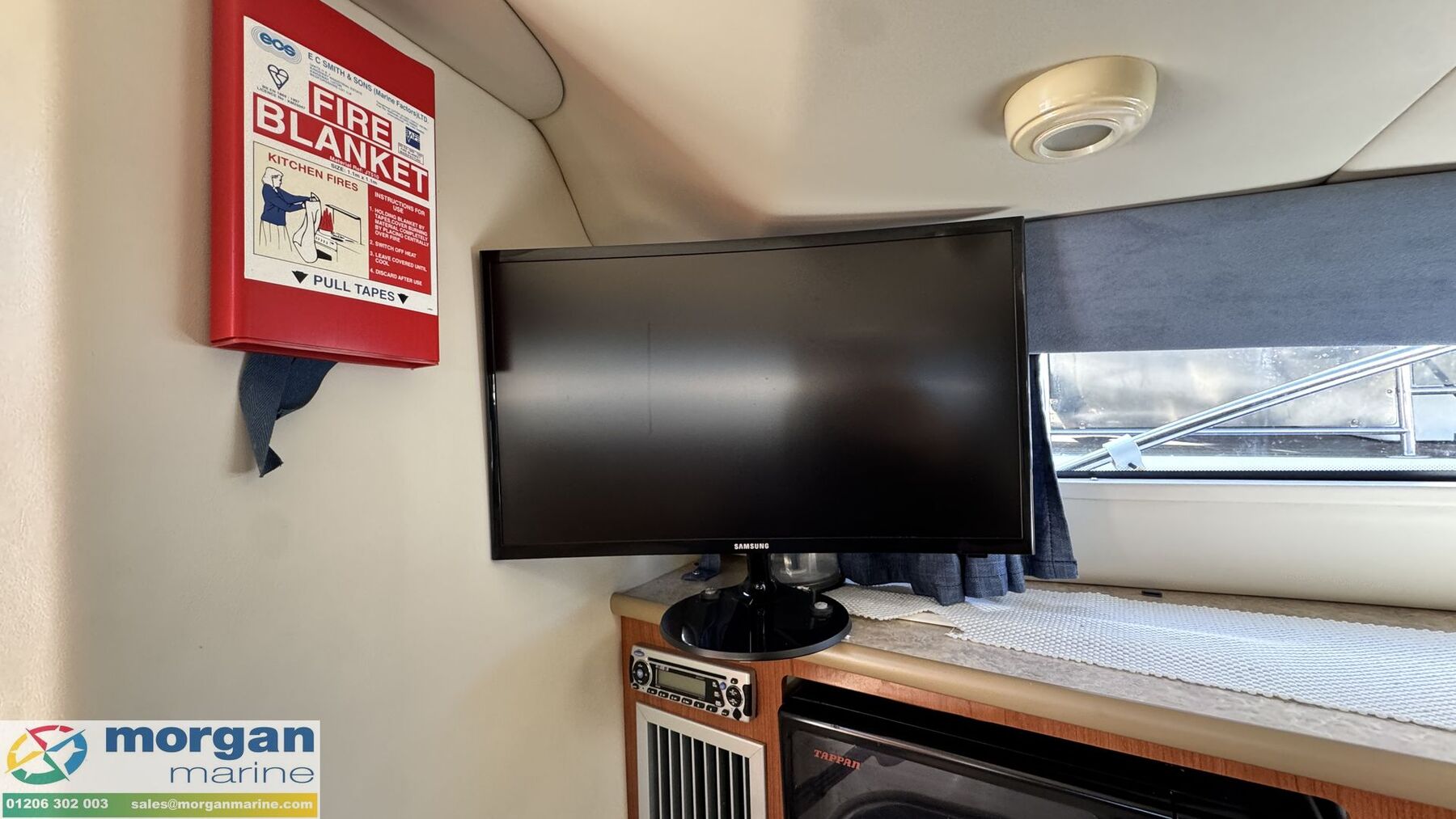 Cabin: Steps down into saloon area. Forward main large double berth with mattress, hatch to deck and portholes. Port side aft cabin which runs below helm position with large double berth with mattress. Saloon starboard side dinette with 2 cushioned bench seats with backrest, table, and cup holders. Dinette converts to a further double berth. Large amount of storage space. Galley to port side with Stainless Steel sink and mixer tap, Origo electric hob, microwave oven, 12v fridge and storage. Starboard side toilet compartment with electric sea toilet, wash basin, mirror, storage and shower. Interior curtains. Cream leather upholstery. Teak effect on galley floor. TV in saloon area.