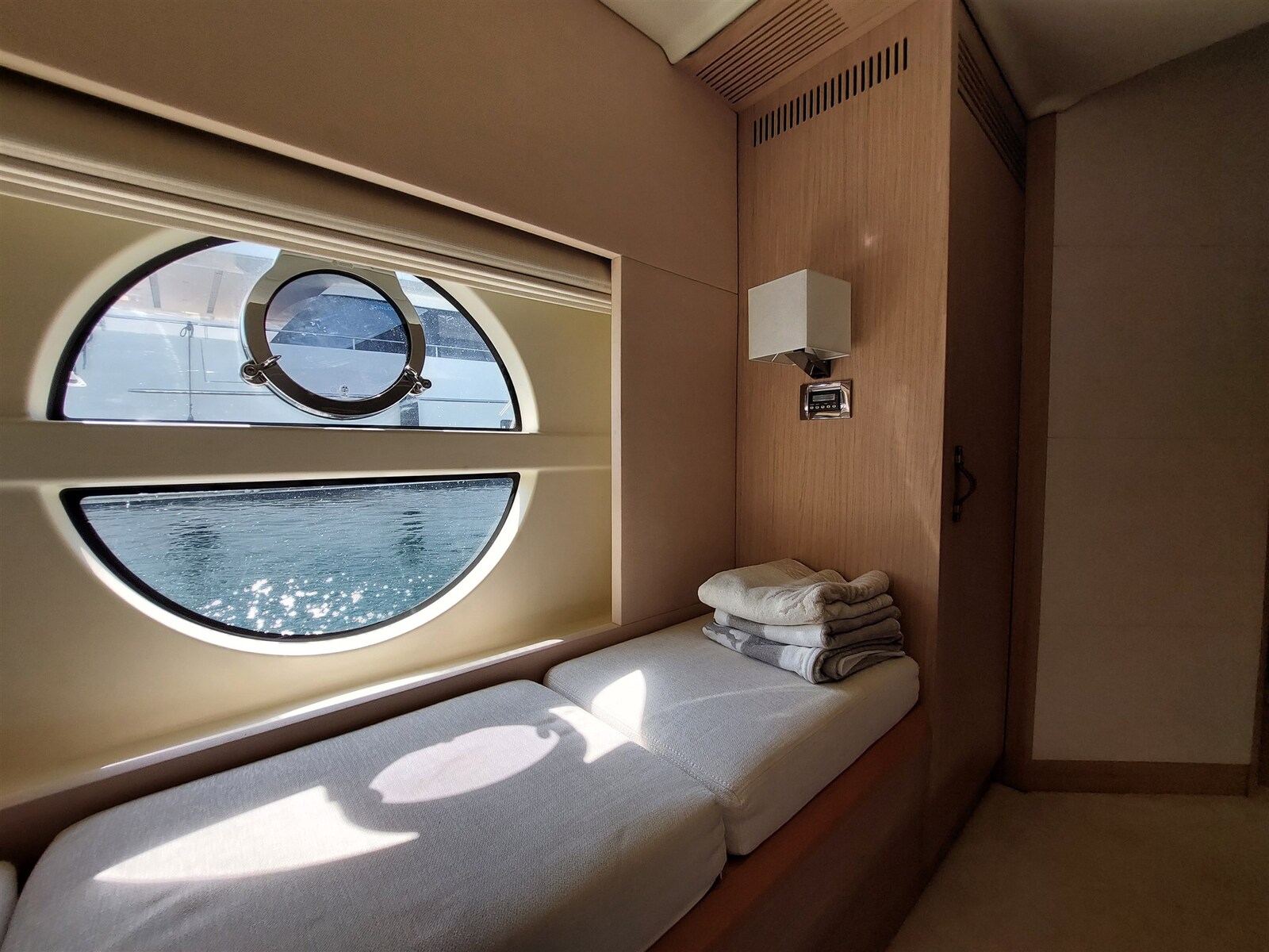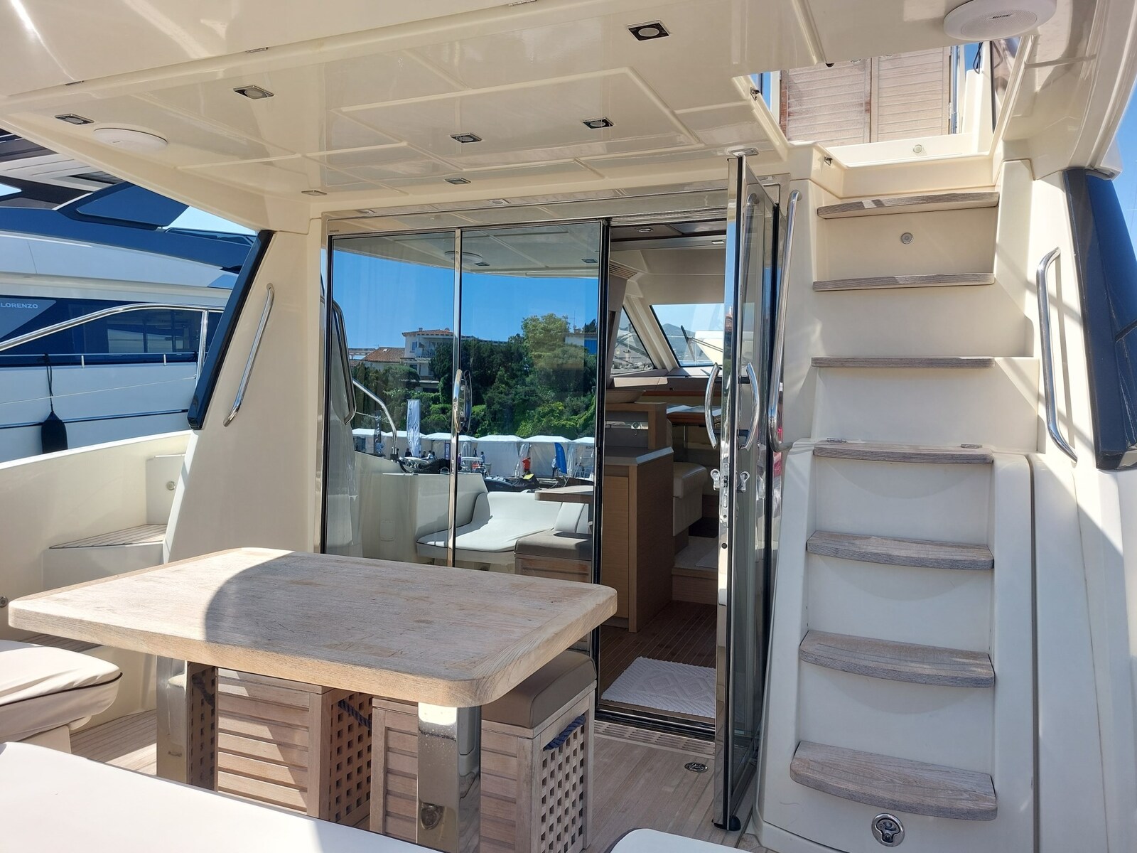 Fume/Gas Detector, 2 Engine Alarm, Bilge Alarm, Water pressure pump, Deck Shower, Twin Steering, Headlights fixed on the stem, Electric Flaps, 2 Flaps Indicators, Anchor Chain Washdown, Washbasin in the cockpit, Courtesy Lights, Gangway, Platform, Automatic Bilge Pump, 2 Electric Bilge Pump, Manual Bilge Pump, Entry door, Teak Cockpit, 2 Shorepower connector (230 V - 50 Hz 63A con cavo di 15m), Water harbor connector system, Electric Windlass, swimming ladder, cockpit table, Living Room Foldable Table, Tender, Horn, Stern Winches, Bow Winches.