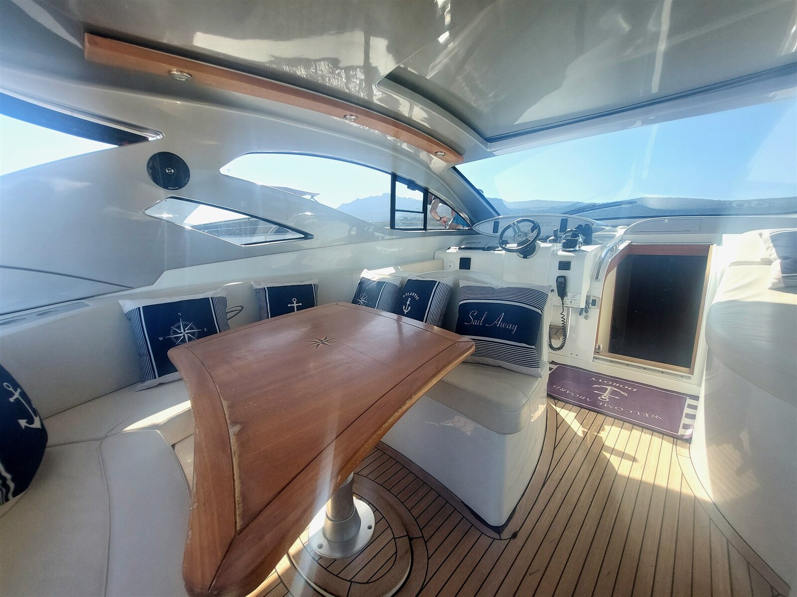 Engine Alarm, Bilge Alarm, Electric Engine Compartment Opening, Water pressure pump, 5 Batteries, Special Colour, Deck Shower, Electric Flaps, Tender Garage, Tender Crane, Hard top, Flaps Indicators, Anchor Chain Washdown, Washbasin in the cockpit, Courtesy Lights, Underwater lights, Gangway, Platform, Automatic Bilge Pump, Entry door, Teak Cockpit, Shorepower connector, Rollbar, Electric Windlass, swimming ladder, cockpit table, Living Room Foldable Table, Tender (CM Mercury 8cv), guard rails with gates, Horn, T-Top, Bow Winches.