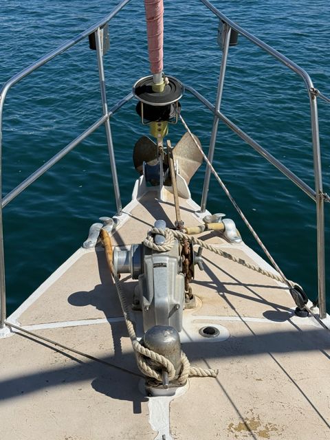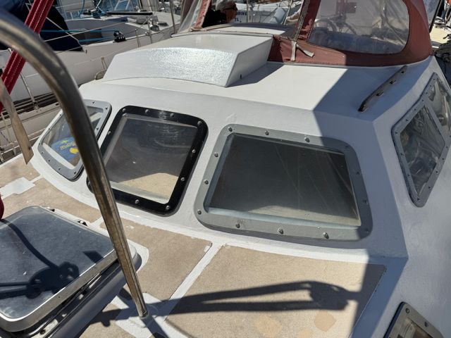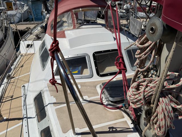 La cubierta de proa es amplia y despejada e incorpora un molinete Lofran Tigre de 1000 W, un ancla Delta de 35 kg con unión de acero inoxidable y un ancla Brittany de 23 kg como repuesto. El cockpit central es protegido y funcional, equipado con ocho winches Lewmar, una brújula Silva montada en columna Morse, una capota anti-UV con una segunda capota completamente nueva, y un lazy-bag prácticamente nuevo. En popa, los pescantes sostienen los paneles solares Siemens instalados en 2024 y una plataforma de baño en acero inoxidable facilita el acceso al mar. Toda la cubierta dispone de un antideslizante Kiwi Grip reciente.