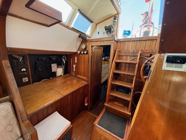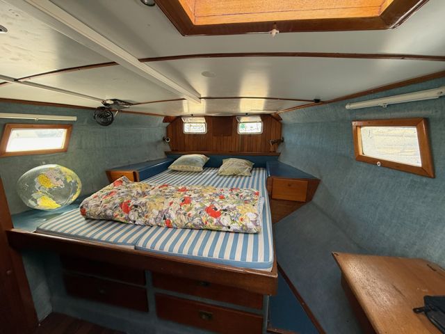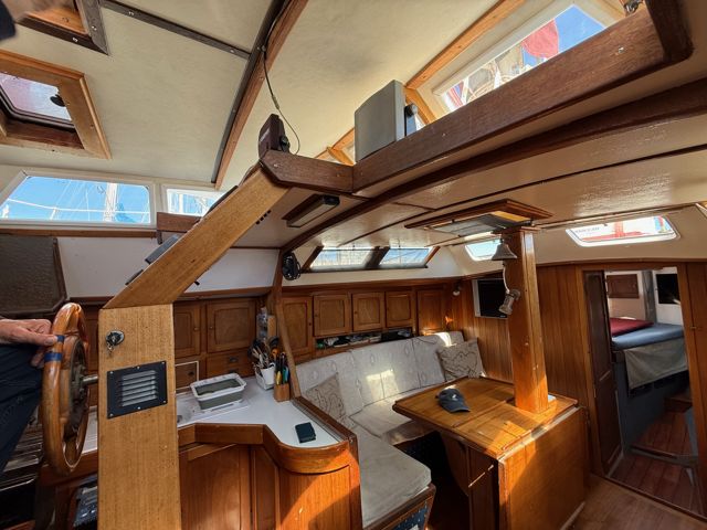 El interior es luminoso y amplio, con una timonería interior que ofrece visibilidad panorámica y una rueda interior conectada mecánicamente con la rueda exterior. El salón cuenta con una gran mesa modular rodeada de múltiples espacios de almacenamiento. La cocina está equipada con cocina ENO, calentador de agua a gas, frigorífico y tres depósitos de agua con un total de 320 litros. La cabina de popa ofrece una amplia cama doble y muchos armarios, mientras que la cabina de estribor dispone de dos literas convertibles. En proa, un baño con bañera y ducha de agua caliente da acceso a la cabina delantera con una cama semi-doble y un enorme cofre para velas y equipos.