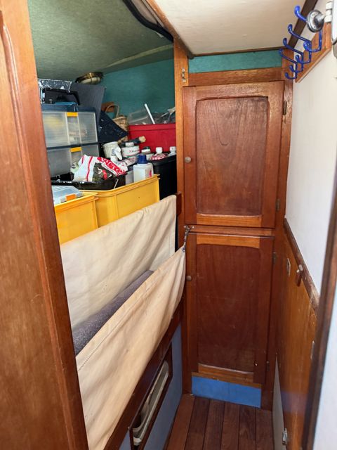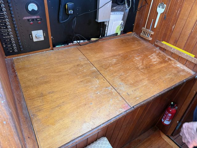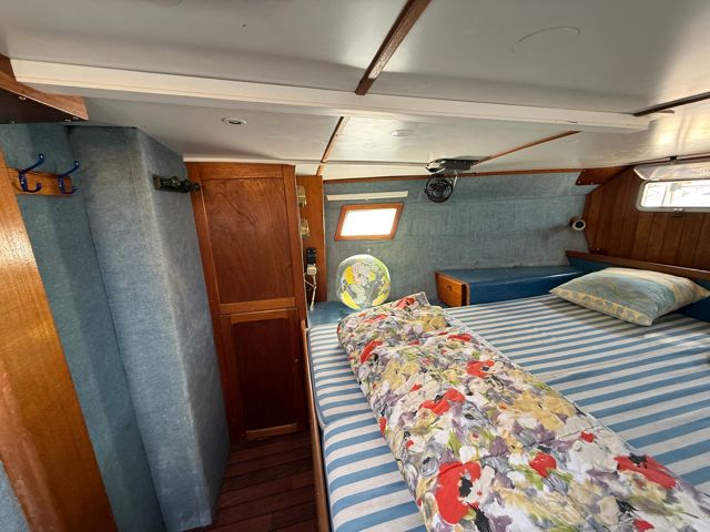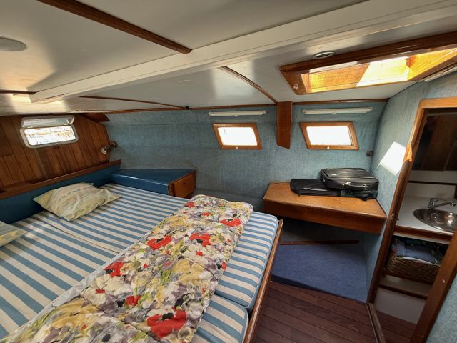 The interior is bright and spacious, featuring an inside wheelhouse offering panoramic visibility and an interior helm mechanically linked to the outside steering. The saloon includes a large convertible table surrounded by generous storage. The galley is equipped with an ENO stove, gas water heater, refrigerator, and three freshwater tanks totalling 320 litres. The aft cabin offers a large double berth and significant storage, while the starboard cabin provides two convertible bunks. Forward, a bathroom with a bath/shower and hot/cold water leads to the forward cabin with a semi-double berth and a very large sail locker.