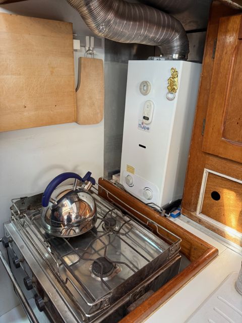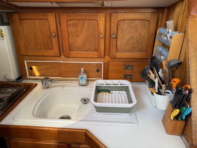 L’intérieur, lumineux et spacieux, dispose d’une timonerie intérieure offrant une vue panoramique ainsi qu’une barre intérieure couplée à la barre extérieure. Le carré accueille une grande table modulable entourée de nombreux rangements. La cuisine est équipée d’un four ENO, d’un chauffe-eau gaz, d’un réfrigérateur et de trois réservoirs d’eau pour un total de 320 litres. La cabine arrière propose une grande couchette double et de nombreux rangements, tandis que la cabine tribord dispose de deux couchettes superposées modulables. À l’avant, la salle d’eau comprend une baignoire sabot avec eau chaude et froide, suivie d’une cabine avant dotée d’une couchette semi-double et d’un vaste rangement pour les voiles et équipements.