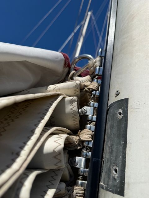 Le gréement comprend un mât Francespar de 15 mètres, un haubanage ACMO entièrement en inox, une grand-voile full-batten en bon état, un génois de 50 m² également en excellent état, une trinquette quasi neuve et un tourmentin jamais utilisé. Toutes les cadènes sont en inox et l’ensemble du gréement a été dimensionné pour la navigation hauturière exigeante.