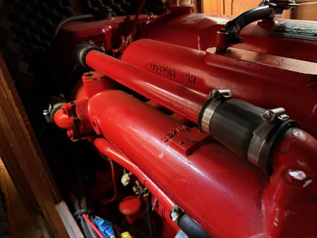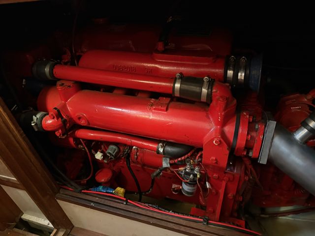 El motor es un Fornaut diésel de 83 CV con unas 3.200 horas, alimentado por un depósito principal de 600 litros integrado en la quilla y un depósito diario de 70 litros. El acceso al motor es excelente desde las cabinas laterales. El circuito de gasoil dispone de pre-filtro y doble filtración, la bomba de agua dulce fue sustituida en 2023 y la hélice tripala Vetus está totalmente protegida por el timón apoyado sobre el codaste.