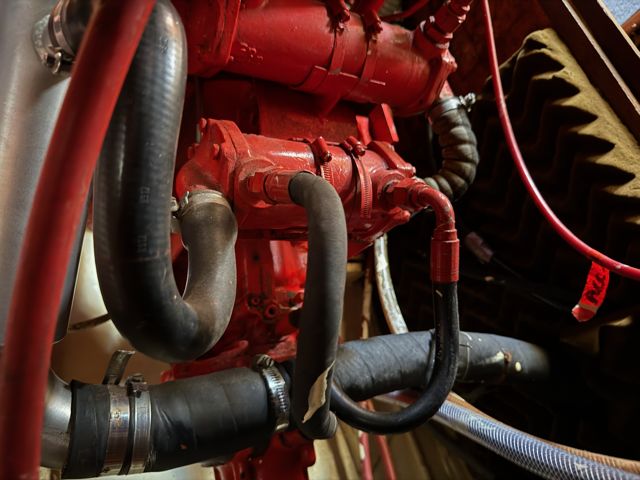 La motorisation repose sur un diesel Fornaut 83 CV totalisant environ 3 200 heures. Il est alimenté par un réservoir principal de 600 litres intégré dans la quille et un réservoir journalier de 70 litres. L’accès au moteur est particulièrement aisé depuis les cabines latérales. Le circuit gasoil bénéficie d’un préfiltre séparateur ainsi que d’une double filtration, la pompe à eau douce a été remplacée en 2023, et l’hélice tripale Vetus est intégralement protégée par un safran reposant sur l’étambot.