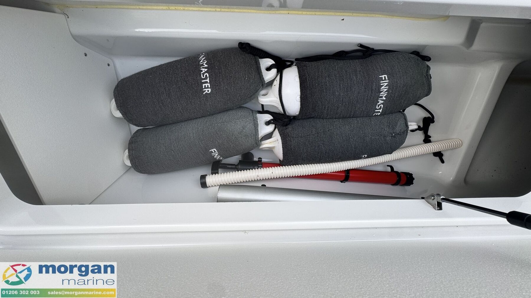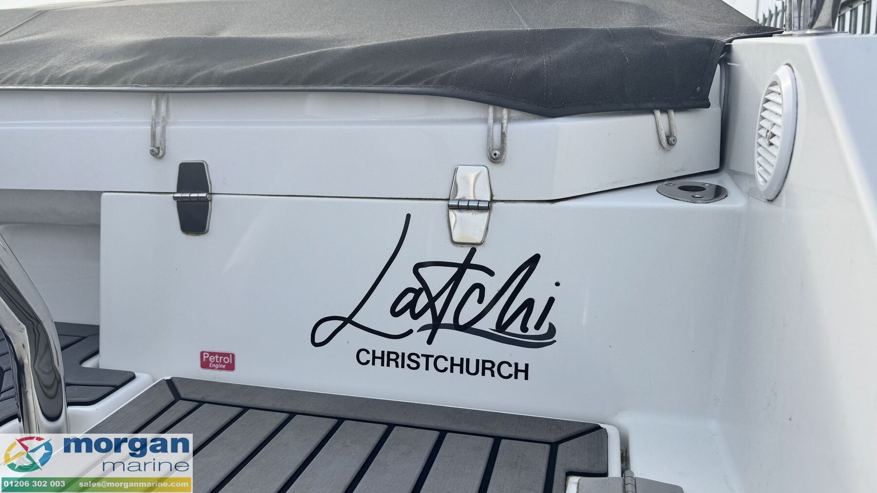 Deck: White GRP hull. Stainless Steel pulpit and handrails. Swim platform with Stainless Steel boarding ladder. Stainless Steel A-frame with tow eye. Bow locker with ladder. Fenders with covers. Flag pole socket. Stern starboard and port storage lockers. Trailer bow ring. Full cockpit cover. Seat covers. Smart deck on cockpit floor. Fold down Bimini with enclosure canopy kit.