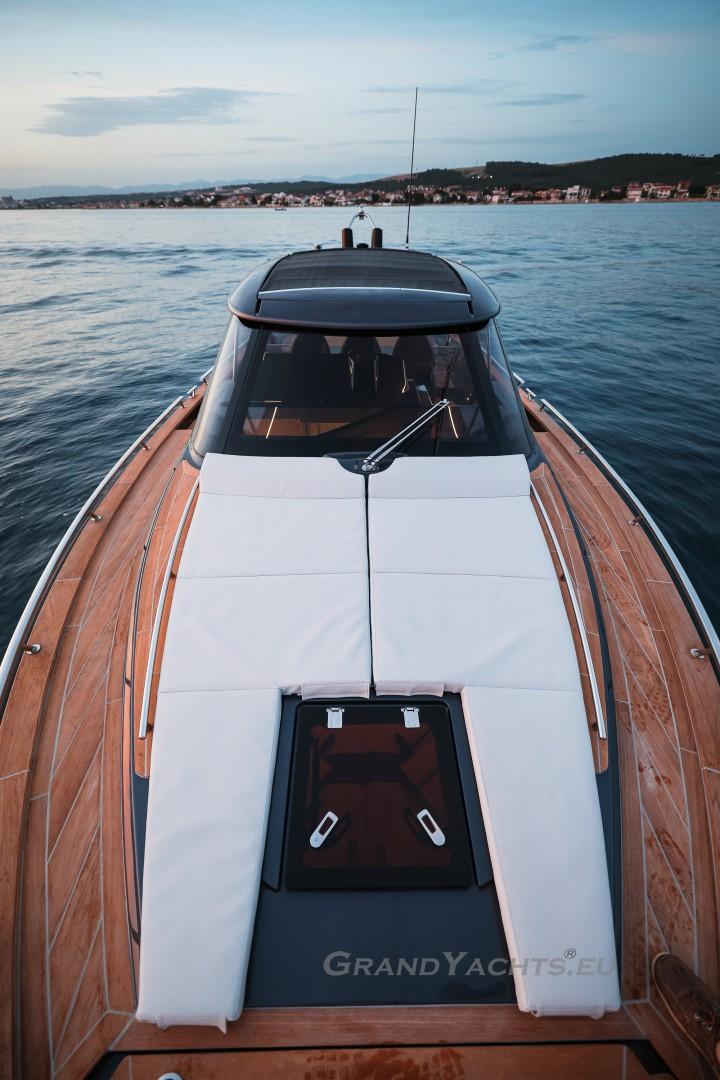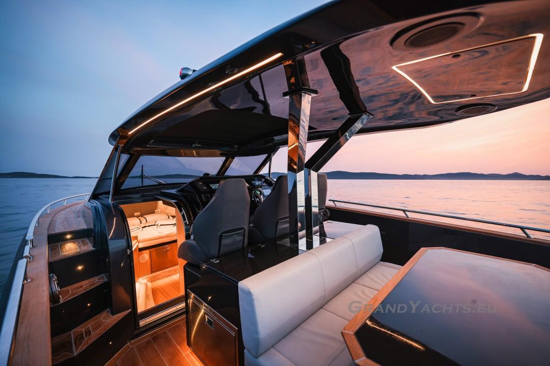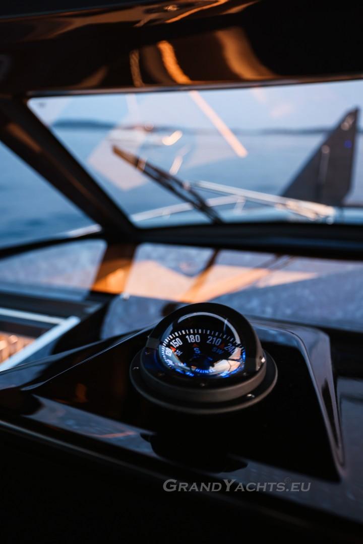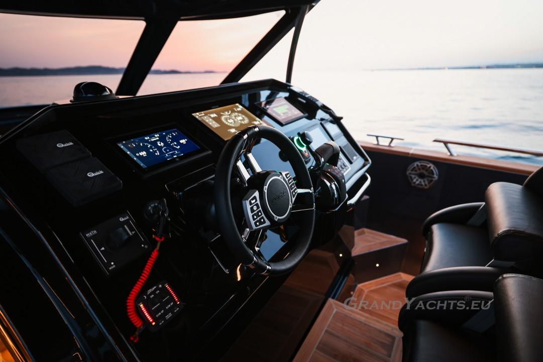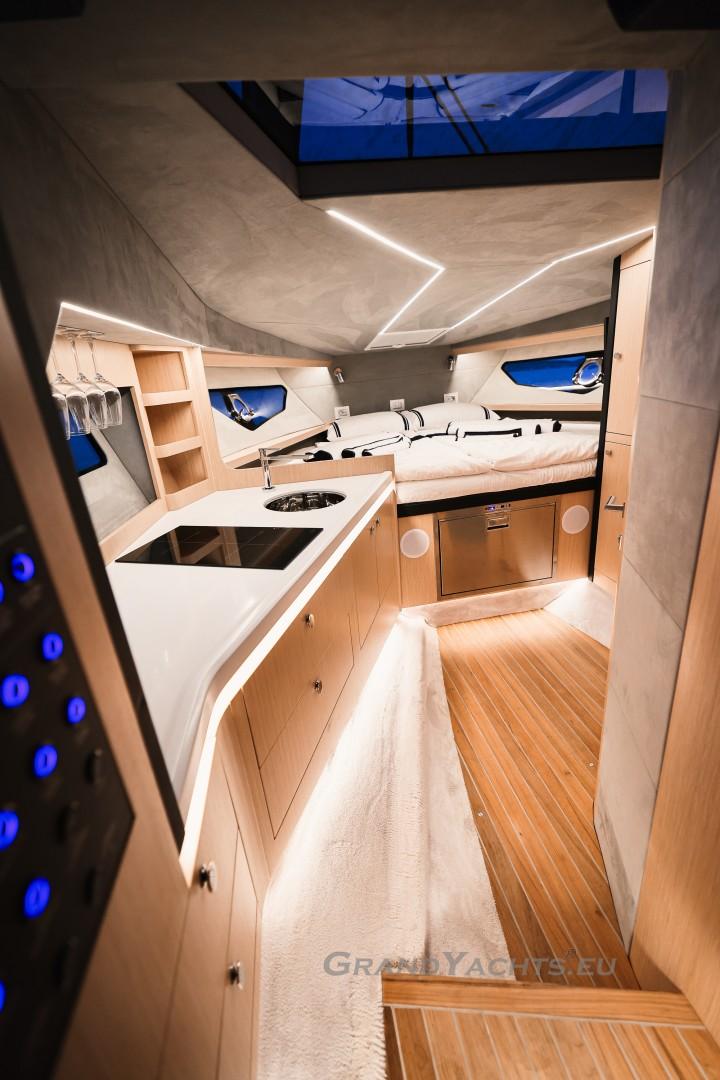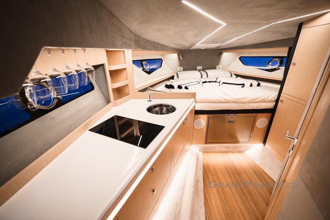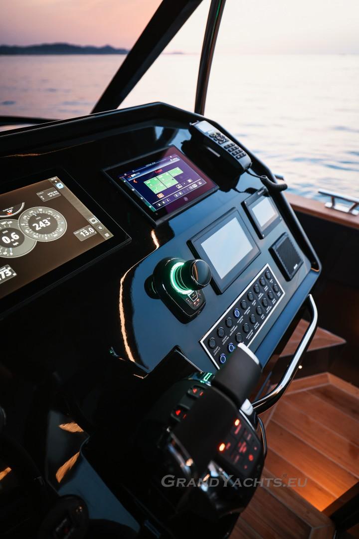 Cockpit Walking at level from the stern platform leads you into the large, open cockpit. You’ll immediately notice two major features: the first being an almost abnormal level of attention to detail and finish I like to call ‘The Focus Touch.’ The second thing is the strong spatial effect, mostly due to the unrestricted fore-and-aft movement and the wraparound hardtop screen, providing unrestricted vision anywhere in the cockpit. Directly aft is an extended sunbed both spacious and comfortable, an indispensable feature on any open sports cruiser. Take a couple more steps forward and you’ll be standing in front of a well-built wet bar which is nearly invisible in closed position. Lift the high-gloss kerrock counter to reveal a stainless steel sink and faucet, as well as an electric grill. The open-air galley also includes storage space, a compartment for litter and space for a wine-cooler. The aft side of the cockpit houses a six-man dining station with an adjustable wood-and-steel table. The sunpad area is stretches along the aft side, which, in conjunction with the non-rounded corners, provide the ultimate lounging experience. It's hard to talk about the cockpit without mentioning the helm. The console is raised compared to the rest of the cockpit, which is essential for good vision as well as being aesthetically pleasing. The vessel is operated from the centre of the three marine-grade, double stitched leather bucket seats, facilitating unimpaired movement for the observer. The solid teak sliding footrests are a very welcome addition, improving comfort while simultaneously being pleasing to the eye. The digital steering wheel is not only mesmerizingly beautiful, but adjustable as well to suit your preferences. The high-gloss, gel coated black dashboard is a dream come true for any captain, housing a bevy of state-of-the-art instruments. A raised panel below the compass contains all the digital engine gauges, as well as the alarm lights. Various waterproof switches are also present, as well as a 12 V USB socket. A rudder angle indicator and a Tridata (Depth / Speed / Trip) display are also standard equipment.