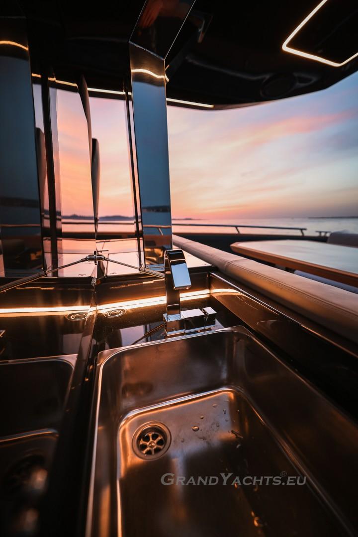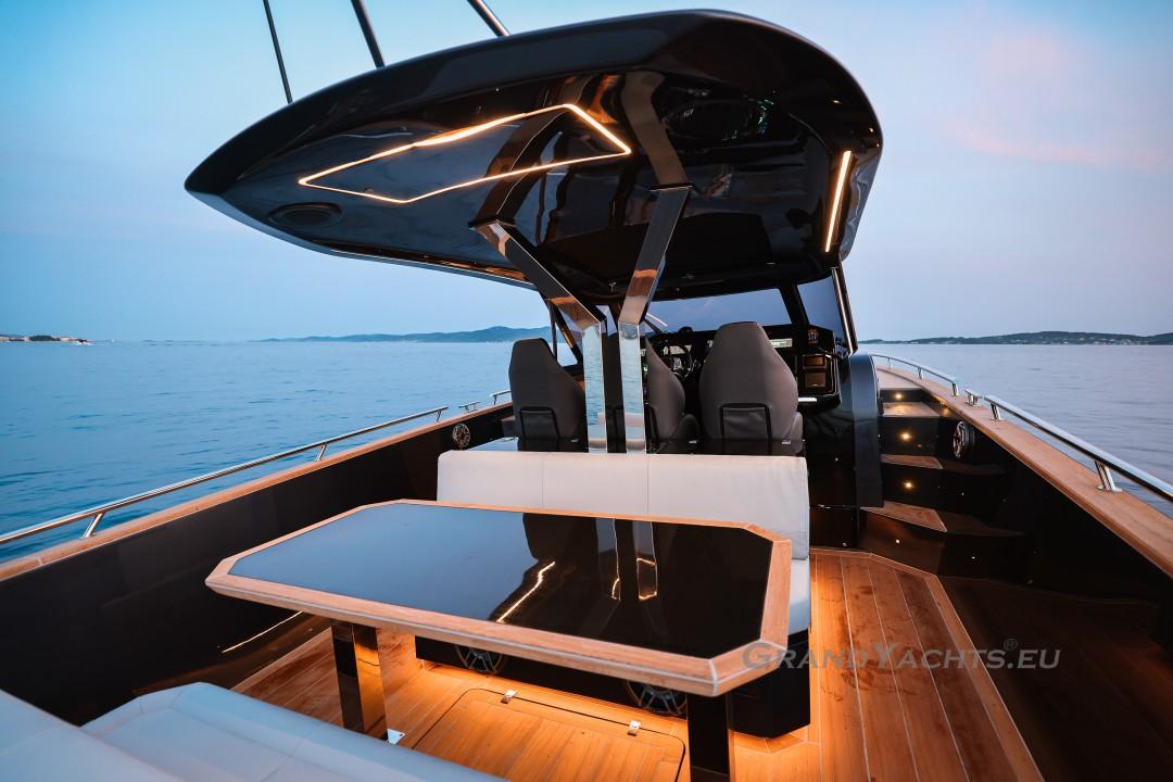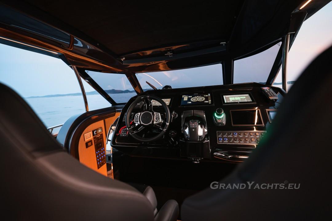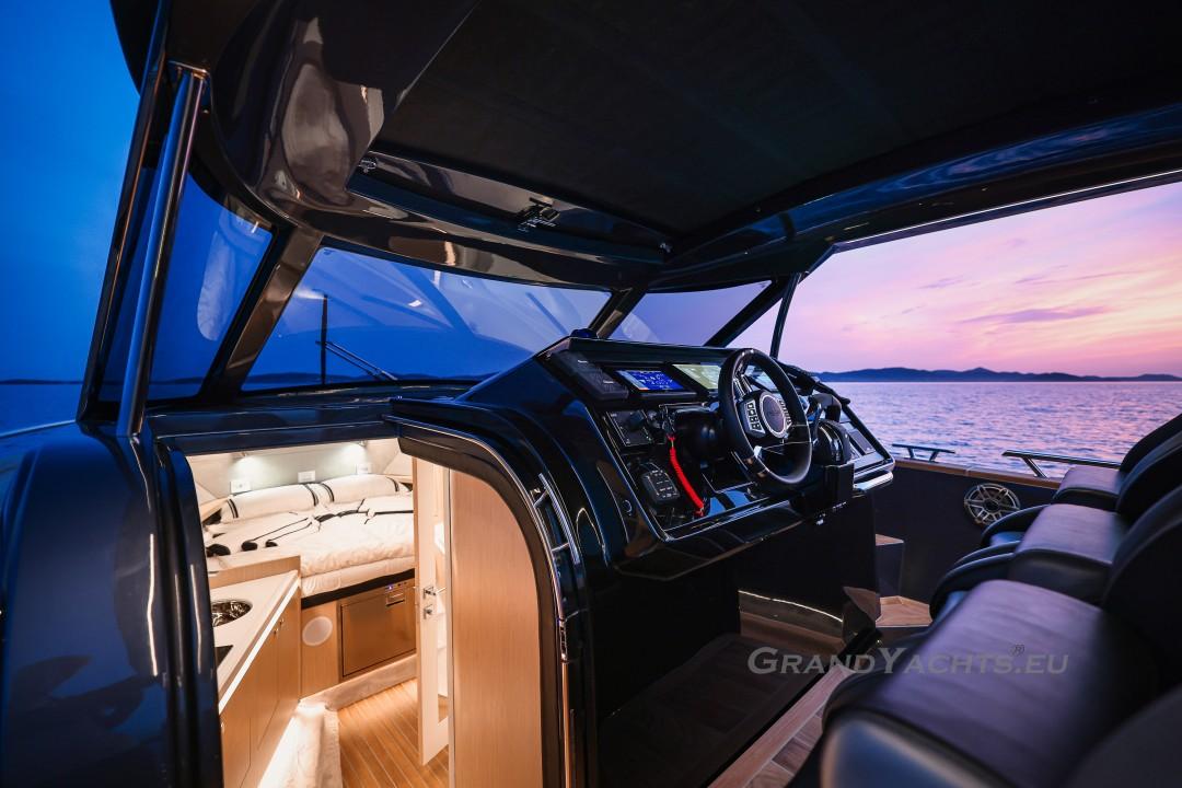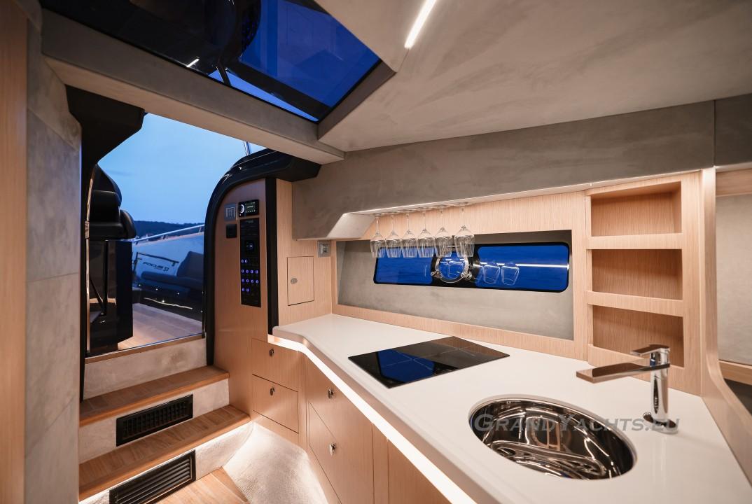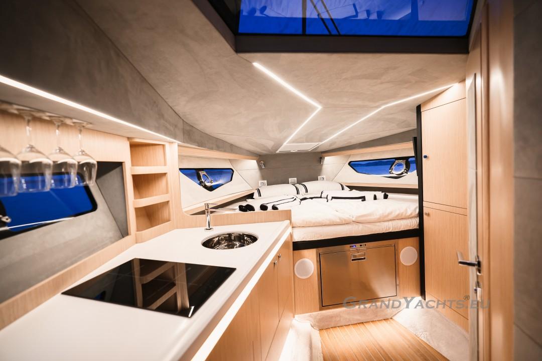 Cockpit Walking at level from the stern platform leads you into the large, open cockpit. You’ll immediately notice two major features: the first being an almost abnormal level of attention to detail and finish I like to call ‘The Focus Touch.’ The second thing is the strong spatial effect, mostly due to the unrestricted fore-and-aft movement and the wraparound hardtop screen, providing unrestricted vision anywhere in the cockpit. Directly aft is an extended sunbed both spacious and comfortable, an indispensable feature on any open sports cruiser. Take a couple more steps forward and you’ll be standing in front of a well-built wet bar which is nearly invisible in closed position. Lift the high-gloss kerrock counter to reveal a stainless steel sink and faucet, as well as an electric grill. The open-air galley also includes storage space, a compartment for litter and space for a wine-cooler. The aft side of the cockpit houses a six-man dining station with an adjustable wood-and-steel table. The sunpad area is stretches along the aft side, which, in conjunction with the non-rounded corners, provide the ultimate lounging experience. It's hard to talk about the cockpit without mentioning the helm. The console is raised compared to the rest of the cockpit, which is essential for good vision as well as being aesthetically pleasing. The vessel is operated from the centre of the three marine-grade, double stitched leather bucket seats, facilitating unimpaired movement for the observer. The solid teak sliding footrests are a very welcome addition, improving comfort while simultaneously being pleasing to the eye. The digital steering wheel is not only mesmerizingly beautiful, but adjustable as well to suit your preferences. The high-gloss, gel coated black dashboard is a dream come true for any captain, housing a bevy of state-of-the-art instruments. A raised panel below the compass contains all the digital engine gauges, as well as the alarm lights. Various waterproof switches are also present, as well as a 12 V USB socket. A rudder angle indicator and a Tridata (Depth / Speed / Trip) display are also standard equipment.