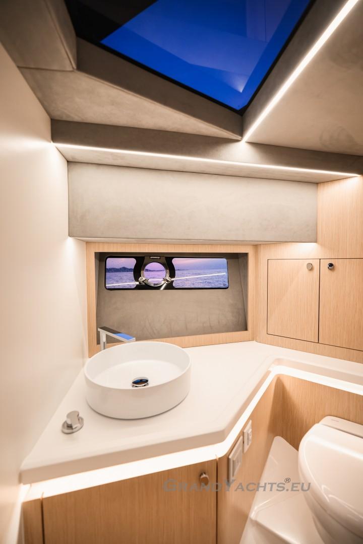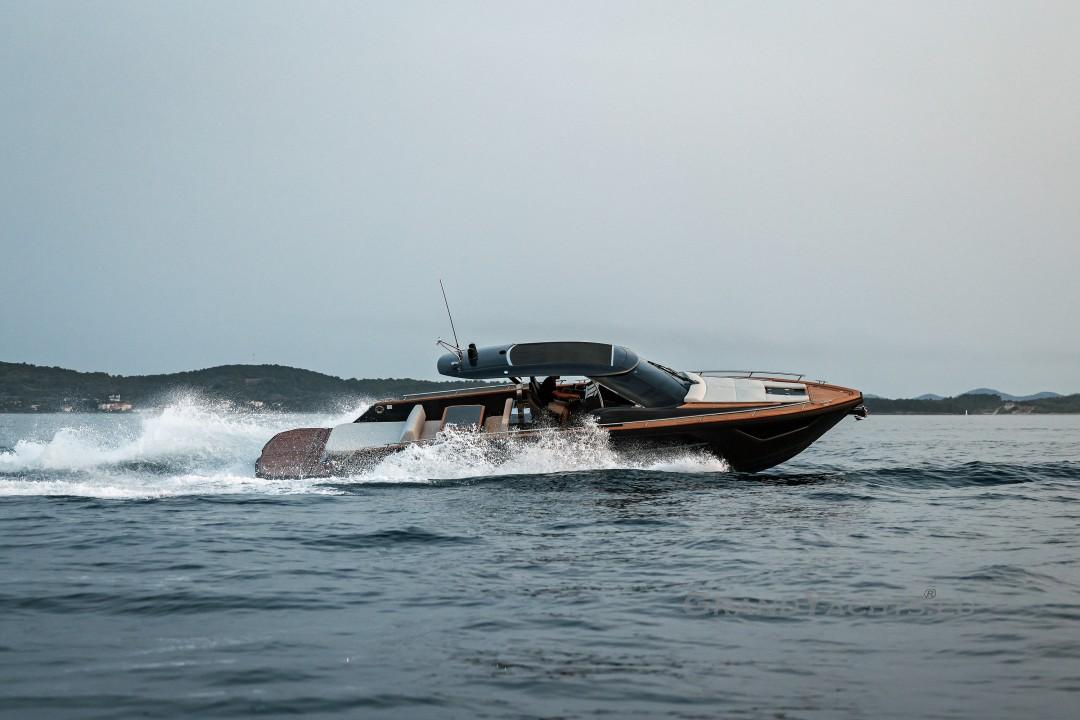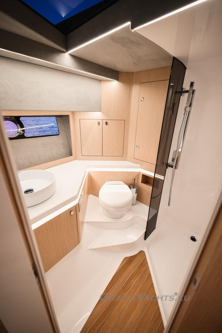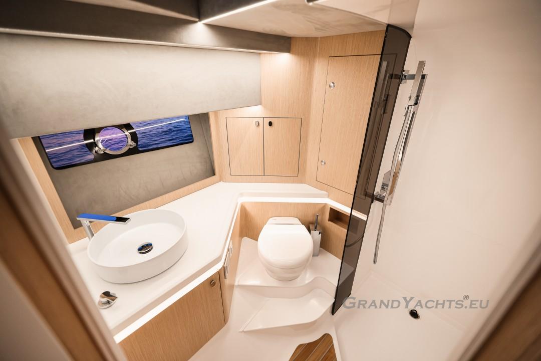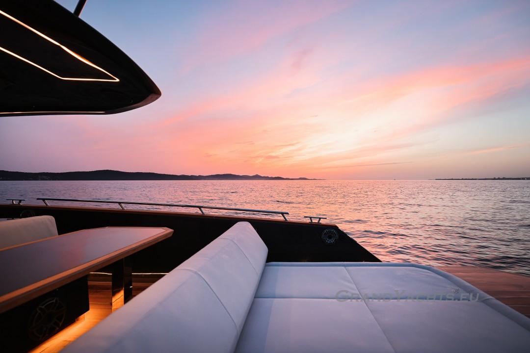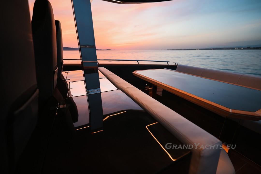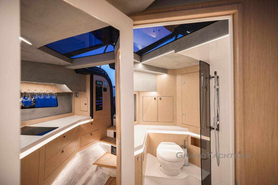 Cockpit Walking at level from the stern platform leads you into the large, open cockpit. You’ll immediately notice two major features: the first being an almost abnormal level of attention to detail and finish I like to call ‘The Focus Touch.’ The second thing is the strong spatial effect, mostly due to the unrestricted fore-and-aft movement and the wraparound hardtop screen, providing unrestricted vision anywhere in the cockpit. Directly aft is an extended sunbed both spacious and comfortable, an indispensable feature on any open sports cruiser. Take a couple more steps forward and you’ll be standing in front of a well-built wet bar which is nearly invisible in closed position. Lift the high-gloss kerrock counter to reveal a stainless steel sink and faucet, as well as an electric grill. The open-air galley also includes storage space, a compartment for litter and space for a wine-cooler. The aft side of the cockpit houses a six-man dining station with an adjustable wood-and-steel table. The sunpad area is stretches along the aft side, which, in conjunction with the non-rounded corners, provide the ultimate lounging experience. It's hard to talk about the cockpit without mentioning the helm. The console is raised compared to the rest of the cockpit, which is essential for good vision as well as being aesthetically pleasing. The vessel is operated from the centre of the three marine-grade, double stitched leather bucket seats, facilitating unimpaired movement for the observer. The solid teak sliding footrests are a very welcome addition, improving comfort while simultaneously being pleasing to the eye. The digital steering wheel is not only mesmerizingly beautiful, but adjustable as well to suit your preferences. The high-gloss, gel coated black dashboard is a dream come true for any captain, housing a bevy of state-of-the-art instruments. A raised panel below the compass contains all the digital engine gauges, as well as the alarm lights. Various waterproof switches are also present, as well as a 12 V USB socket. A rudder angle indicator and a Tridata (Depth / Speed / Trip) display are also standard equipment.