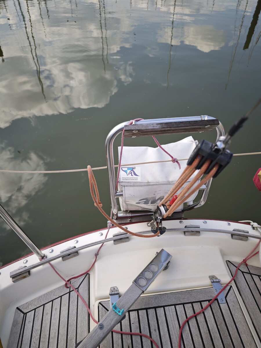 Sprayhood (und Kuchenbude), Winterpyjama (Hafenpersenning über Plicht und Sprayhood), Kussens, Stuurstand afdekking.