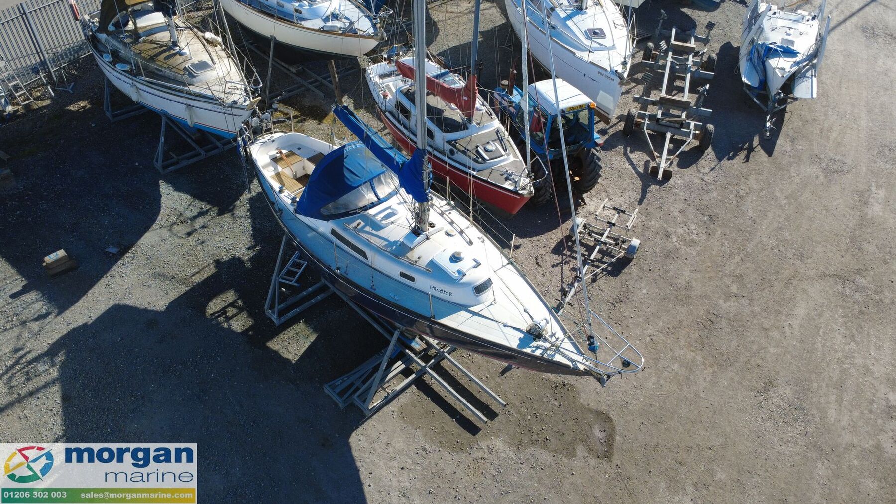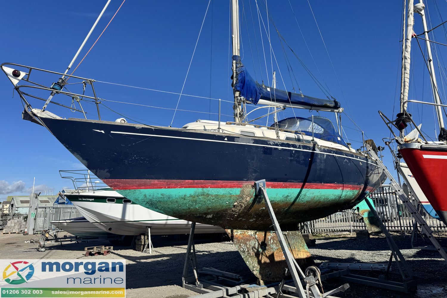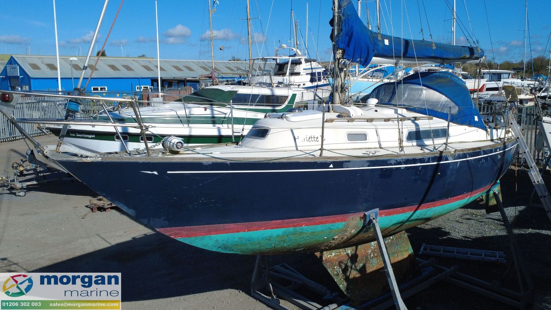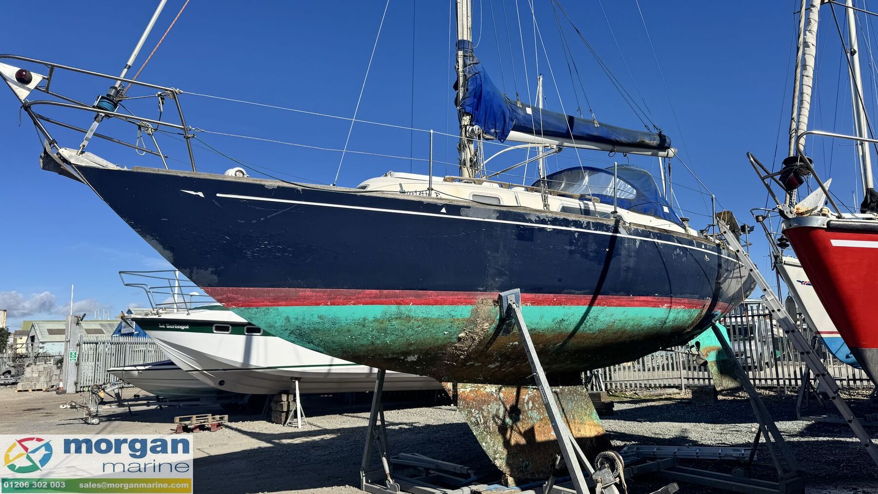 Deck: GRP hull. Cast iron fin keel. Electric windlass with Lofrans Royal anchor, bow roller, chain and rope. Main spray with cover 160 sqft. Furling Genoa - 305 sqft. 2 jibs. Stainless Steel pulpit and Pushpit, stanchions and guard rails. 2x Lewmar 40 genoa winches. 2x Lewmar 25 secondary winches. Lewmar 25 and Barton winch on coach roof. Antal 16 winch on mast. Deck stepped masthead sloop. Gold anodised alloy single spreader mast and stab / roller boom. Facnor C30 roller furling headsail gear. 1x 19 Stainless Steel standing rigging - age unknown. Wheel type backstay tensioner. Terylene running rigging. Removable boarding ladder. 2x Tannoy ventilators. Alloy Genoa tracks with roller cars, X section main sheet track with traveller and adjusting tackles. Mooring cleats. Teak coach roof grab handles. Fenders and lines. Boat hook. Blue cockpit spray hood.