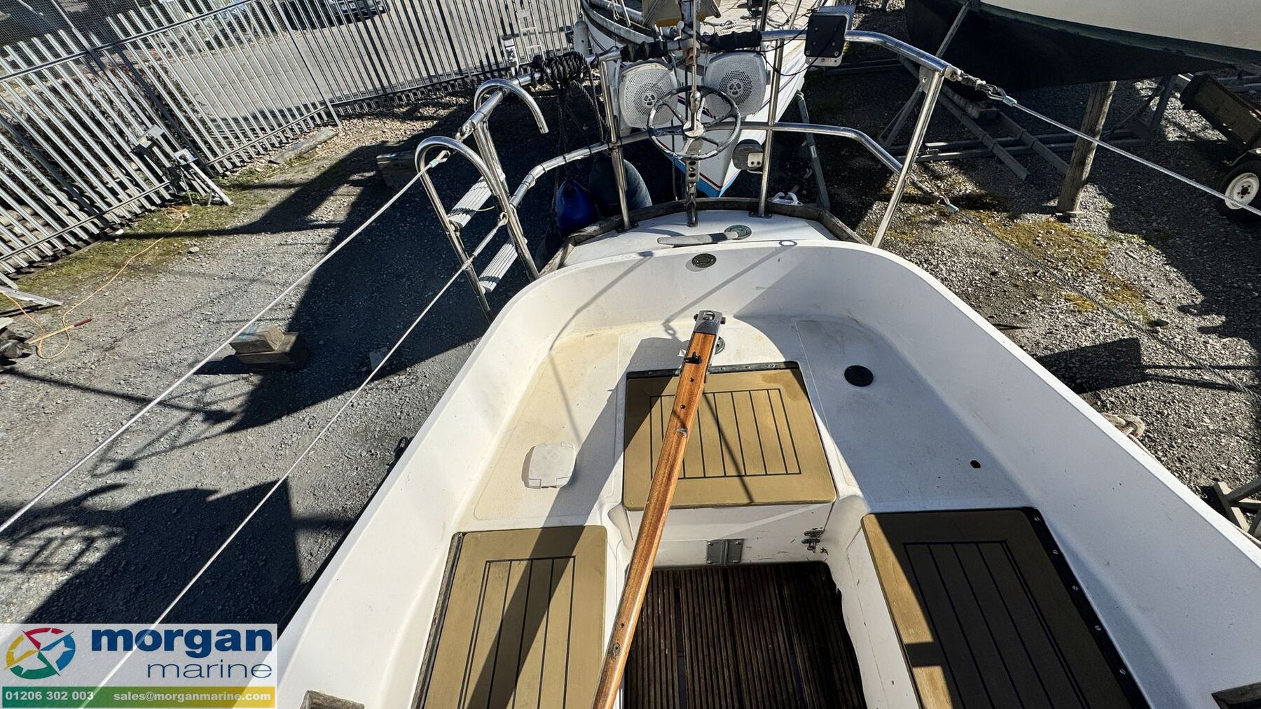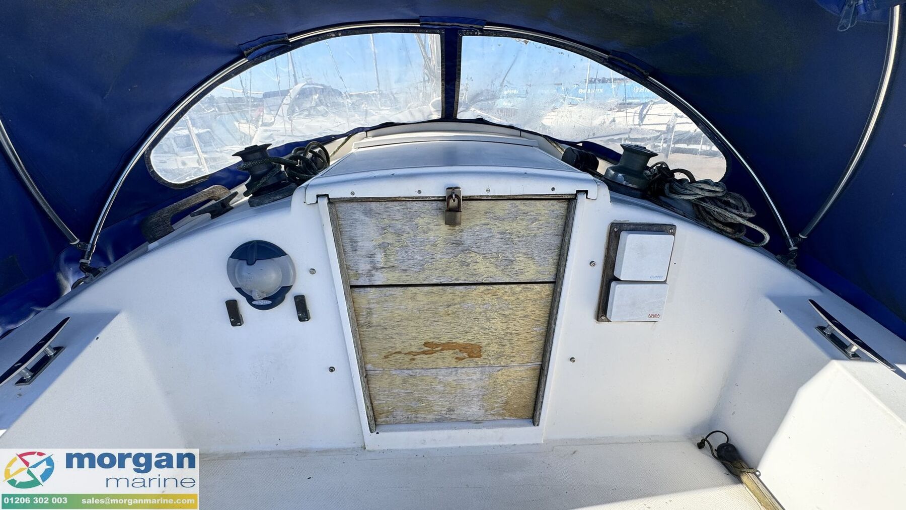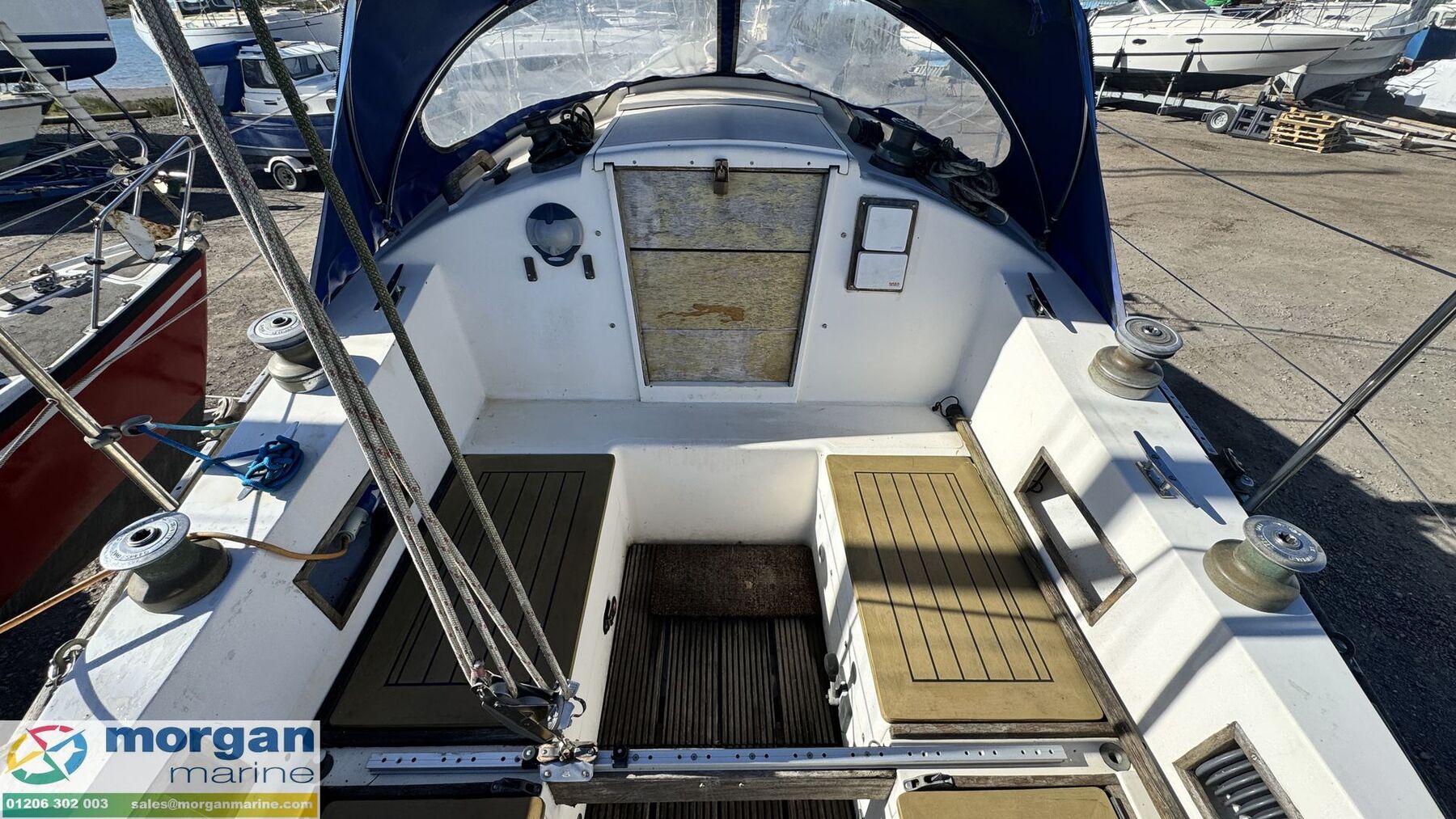 Cockpit: Skeg hung rudder with tiller steering. Painted GRP deck, superstructure and draining aft cockpit. Port and starboard teak decking bench seating with cockpit lockers. In hull cockpit cut out storage areas. Lazarette stern locker. Slide out washboards door for saloon access. Cockpit grating floor.