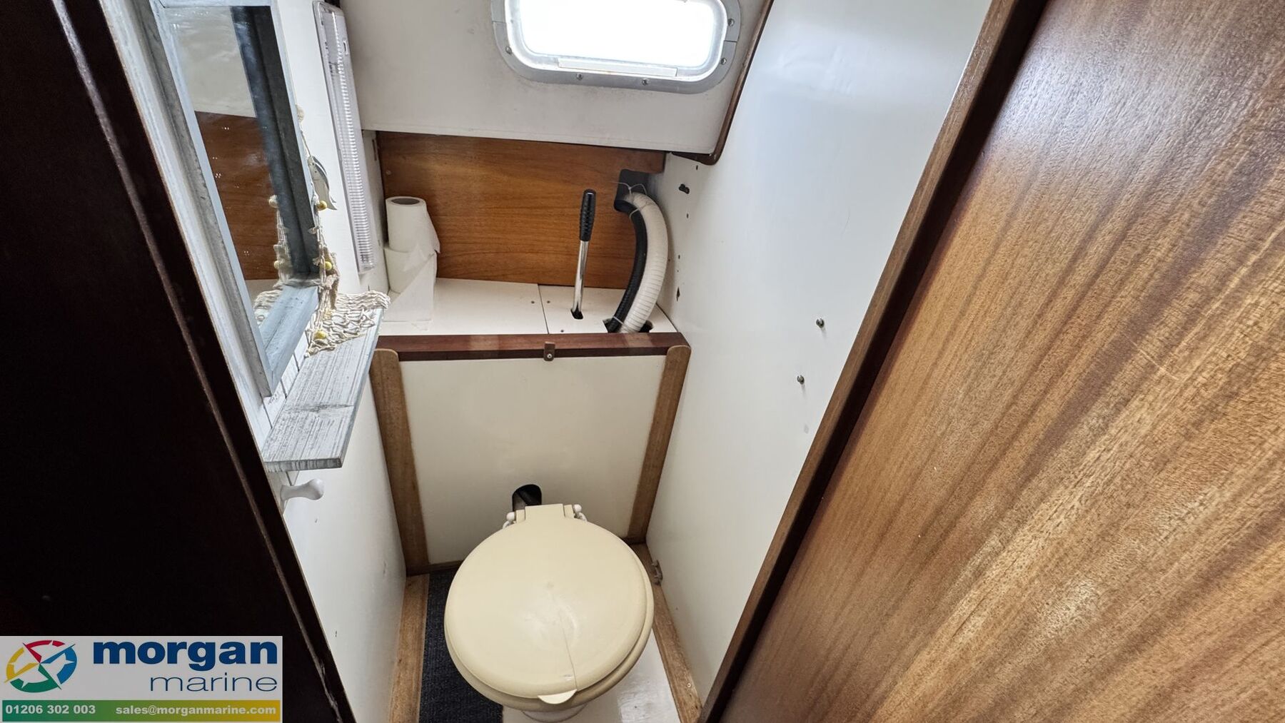 Cabin: Steps down into saloon area. Large saloon area with dinette to port side with lowering table converting into berth. Saloon with 5ft 10in headroom. Galley to starboard side with 240v microwave oven, 240v single hob, sink with cold water supply, Engel 12v fridge and large amounts of storage. Saloon and cabin upholstery in beige tweed new in 2009. Chart table to starboard side with quarter berth aft. Forcabin with Vee berth with opening deck hatch. Port side toilet compartment with manual sea toilet, mirror and port hole.