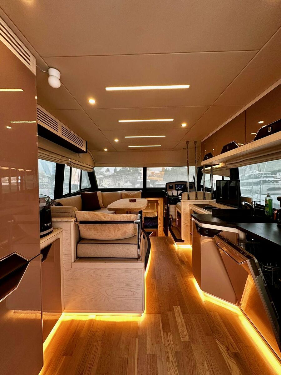 Chiller air conditioning throughout, Onan 11 kW generator, new 600 Ah lithium batteries, 650 W solar panels, 180 L/h watermaker, bow and stern thrusters, latest-generation Raymarine navigation (GPS / radar), full teak decks, hydraulic passerelle, fully equipped galley, dishwasher, 10 kg washing machine, Hertz sound system, night-vision and stern cameras.