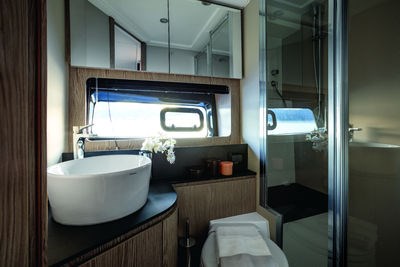 2 Engine Alarm, Bilge Alarm, Alternator, Water pressure pump, Shore power cable, Guard rail, Deck Shower, Directional Spotlight, Anchor mount, 2 Electric Flaps, Hard top (elettrico), Fire Extinguishing System, 2 Flaps Indicators, Washbasin in the cockpit, Courtesy Lights, 6 Fenders, Gangway (Idraulica a scomparsa Besenzoni), Platform (Idraulica abbattibile), 4 Automatic Bilge Pump, Entry door, Shorepower connector, Voltage Rectifier, Electric Windlass, swimming ladder, cockpit table, Living Room Foldable Table, Horn, Bow Winches.