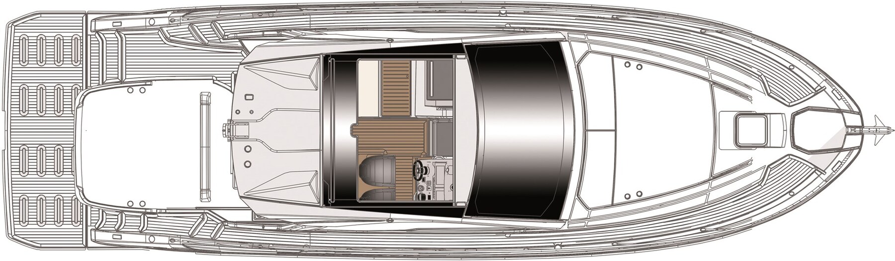 AIS, Angolo barra, 2 Comando motori elettronico (Volvo Penta), 2 Computer di bordo (Volvo Penta), Contametri catena, Contamiglia (Garmin), Ecoscandaglio (Garmin), GPS (Garmin), Joystick, Monitor dei consumi, Pilota automatico (Garmin), 2 Plotter (Garmin), Quadro comandi, Radio VHF (Garmin).