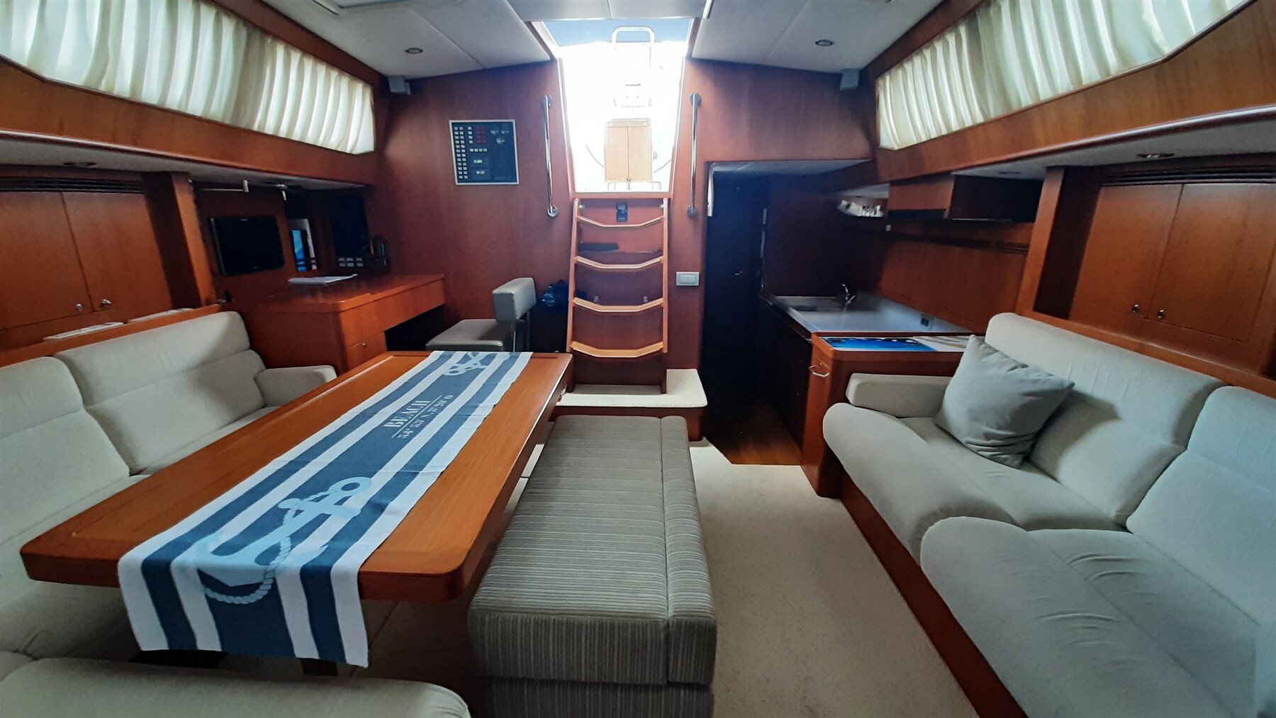 Barril de madera con tira de acero inoxidable, reflector de radar CYCLOPS II, luz estroboscópica y luz tricolor en la cabeza del árbol, todos los ojos de buey con persianas y mosquiteras, hélice GORI de 3 palas, extractor de humos en la cocina,