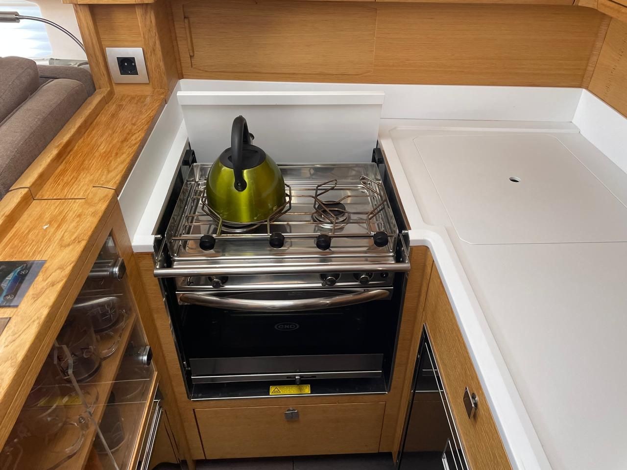 Cuisine (Fußpumpe für Seewasser), Cuisinière, Réfrigérateur intérieur (mit TK-Fach), Groupe froid (105l mit Schubladen).
