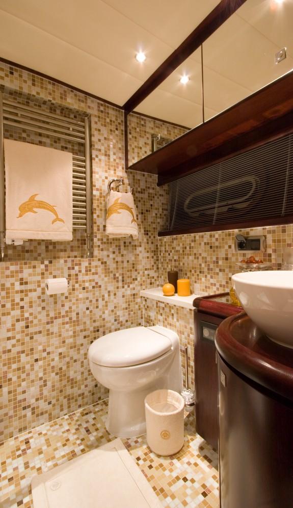 She sleeps 6 in two double staterooms, both with ensuite central heated bathrooms with shower, wash basins and toilets. Her third guestroom on starboard side is also equipped with an en-suite bathroom.