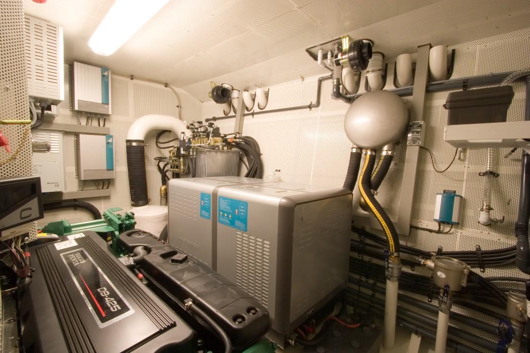 Her true masterpiece is without doubt her double engine room, engineered to perfection in every form! The engineering of Pacific yachts shows very clean and well installed high quality equipment. A very large hydraulic PTO was installed to give hydraulic power to all features. Inside her engine room you find features like the HR Kabola central heating with hot water tap function, double Separ filters with cross-overs, heavy duty pumps, the hydraulic stabilizers, chiller systems and many more. One extra feature well worth mentioning is her as new 1500rpm generator with exhaust and water separator. The gen-set delivers 16 kilowatts of power without any noise both inside and outside.