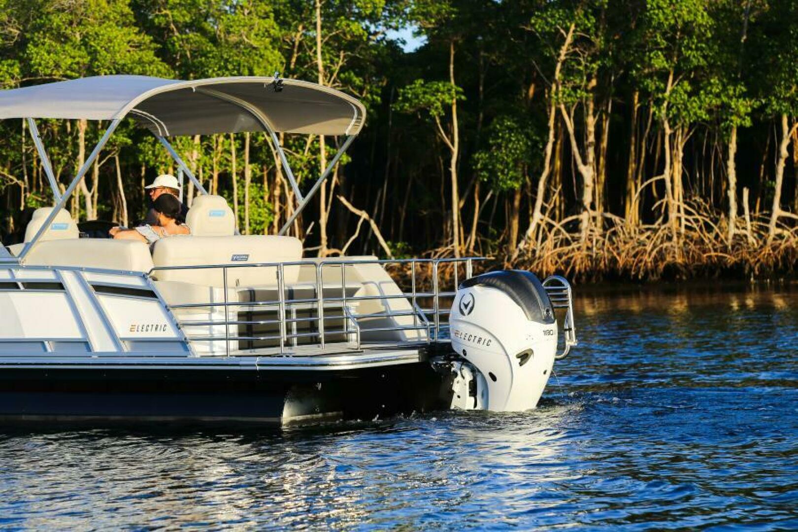 The V24 Electric Pontoon is a 100% electric luxury boat built for smooth, powerful, and sustainable cruising. Powered by the E-Motion™ 180E electric outboard delivering 180 HP, it offers instant torque, almost noiseless operation, and zero emissions. With a spacious layout for up to 12 passengers, it includes plush seating, a ski tow bar, Bluetooth battery monitoring, and a sleek smart display. Enjoy a cruising range of 40 to 90 nautical miles* with single or dual battery options. Charging is easy—just plug in at any standard dock or trailer outlet using 120V or 240V (30–50 AMP) shore power. Ideal for spending quality time with family and friends or exploring your favorite waterways, the V24 is built to elevate your on-water experience.