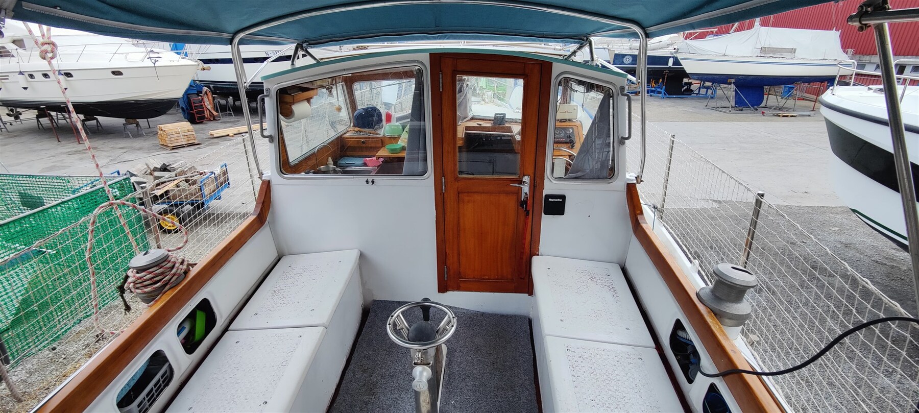 Steering wheel in the deckshouse, tiller steering in the cockpit