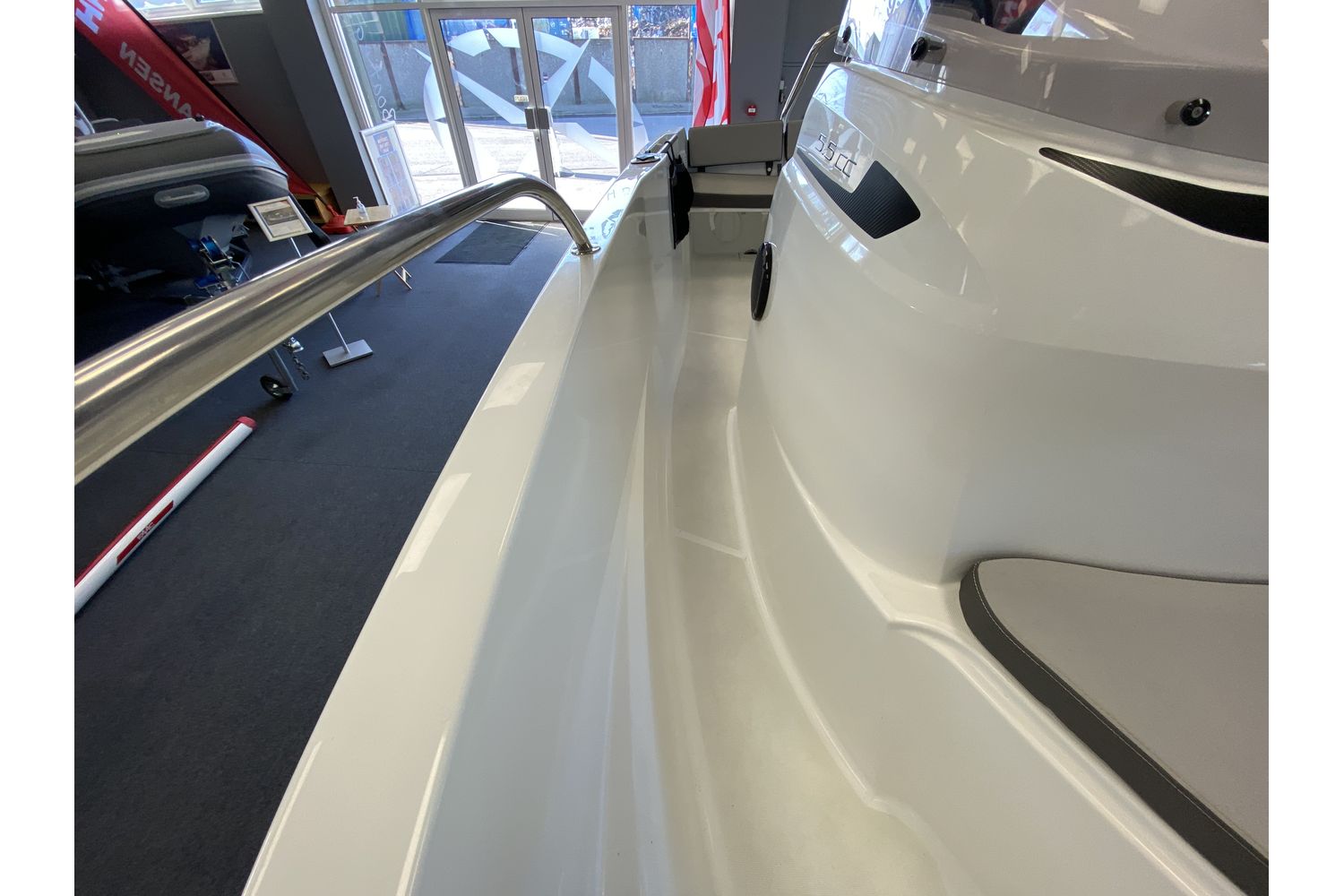 Cockpit: Console with folding door (for storage). Helm position with engine controls electronics, compass and fuel gauge. Adjustable pilot and co-pilot bolster seats. Aft cockpit sliding bench with cushions and backrest. Aluminium bimini - graphite. Covers for console and seats.