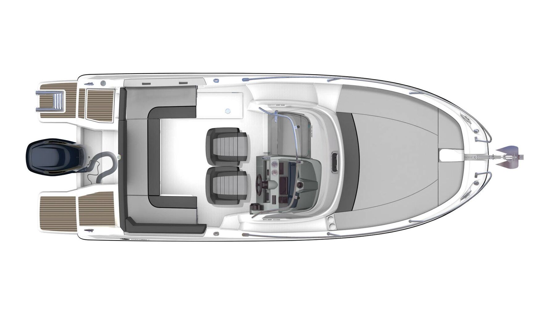 Cockpit: Helm position with engine controls, compass and electronics. Adjustable pilot and co-pilot bolster seats (large model). Aft cockpit bench with cushions and backrest + storage. Port and starboard side luxury folding benches with cushion. Cup holder. Covers for steering console + seats. Cockpit table. Folding aft sundeck.