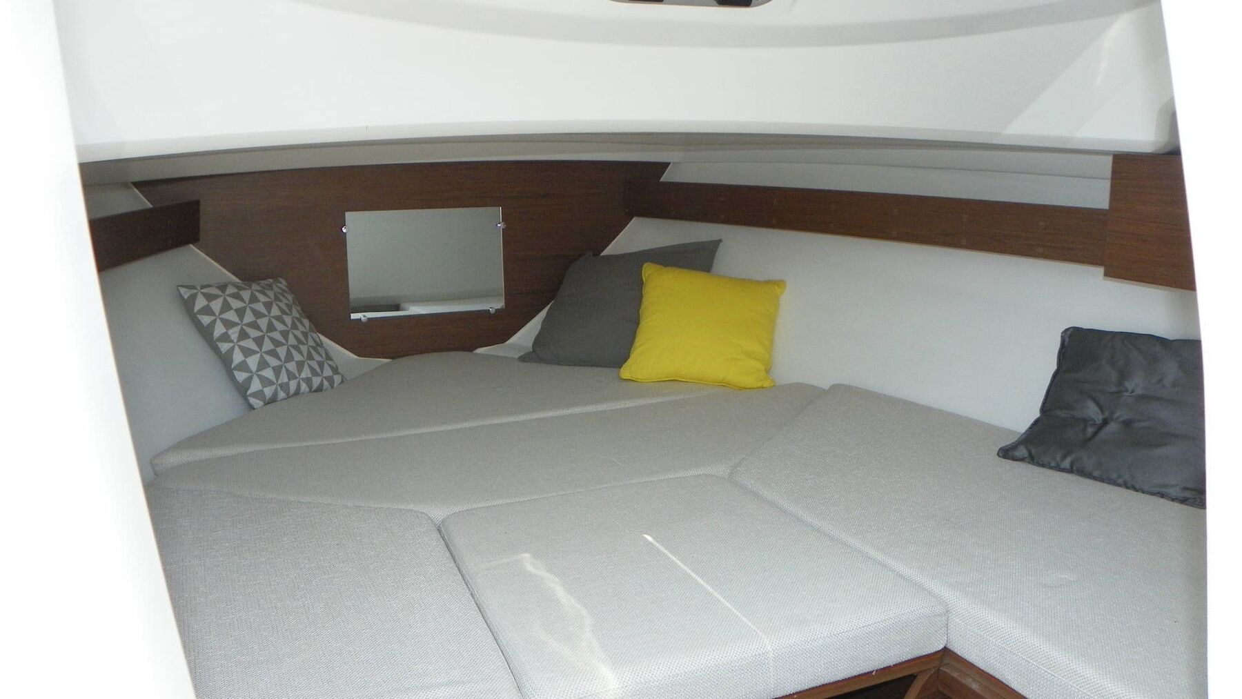 Cabin: 2 berth cuddy with cushions + double berth complement. Overhead lights. Transparent black plexi sliding door. Opening porthole in console. Front sundeck mattress.