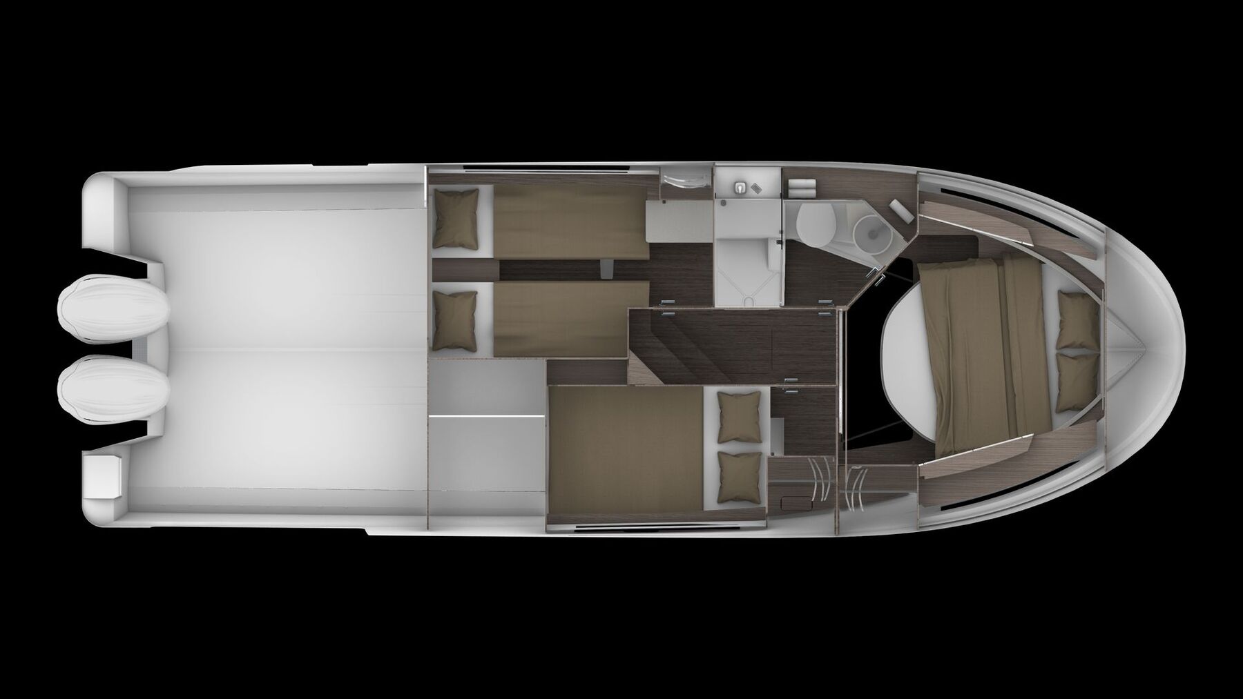 Machinery: 2x Yamaha 300hp Steer By Wire - white + autopilot + joystick + variable bow thruster for great performance and easy control. Zipwake automatic trim tabs for increased comfort. Diesel forced air heating. Manual and electric bilge pumps. Volcano engine lock. Fuel capacity: 2x 370L - with outside fill. Water capacity: 160L (+ 100L additional) with gauge and connector for direct water supply from shore.