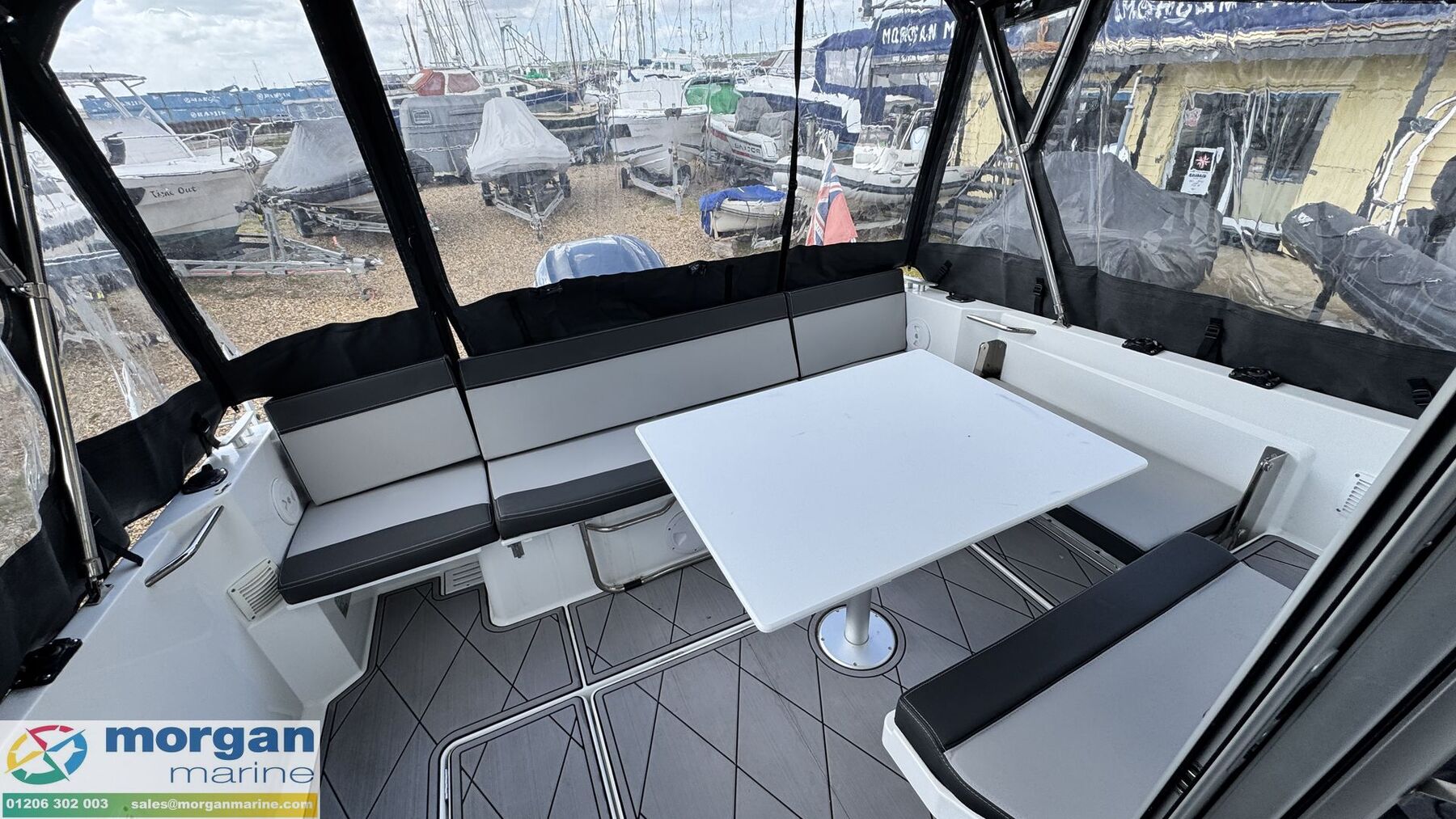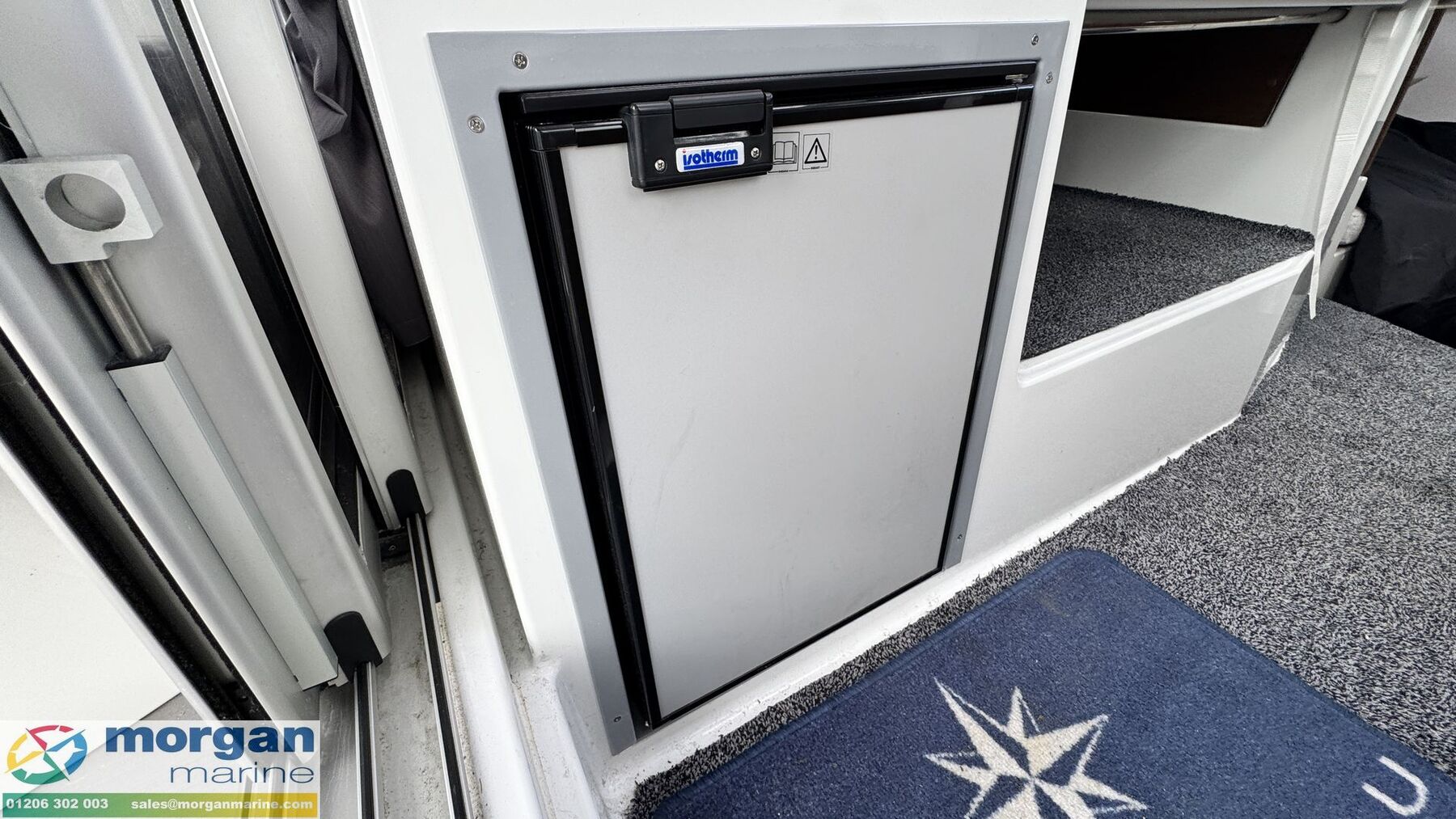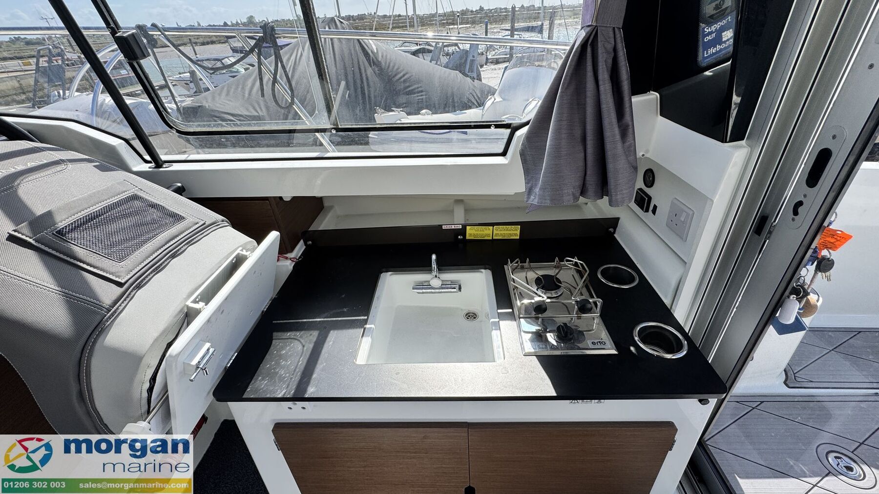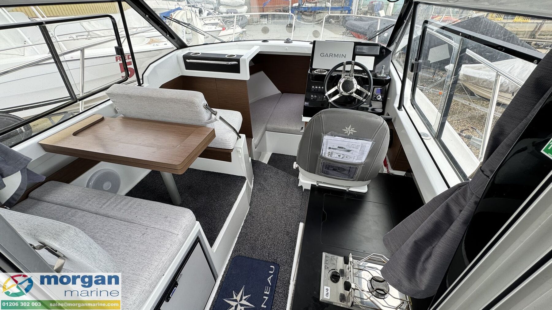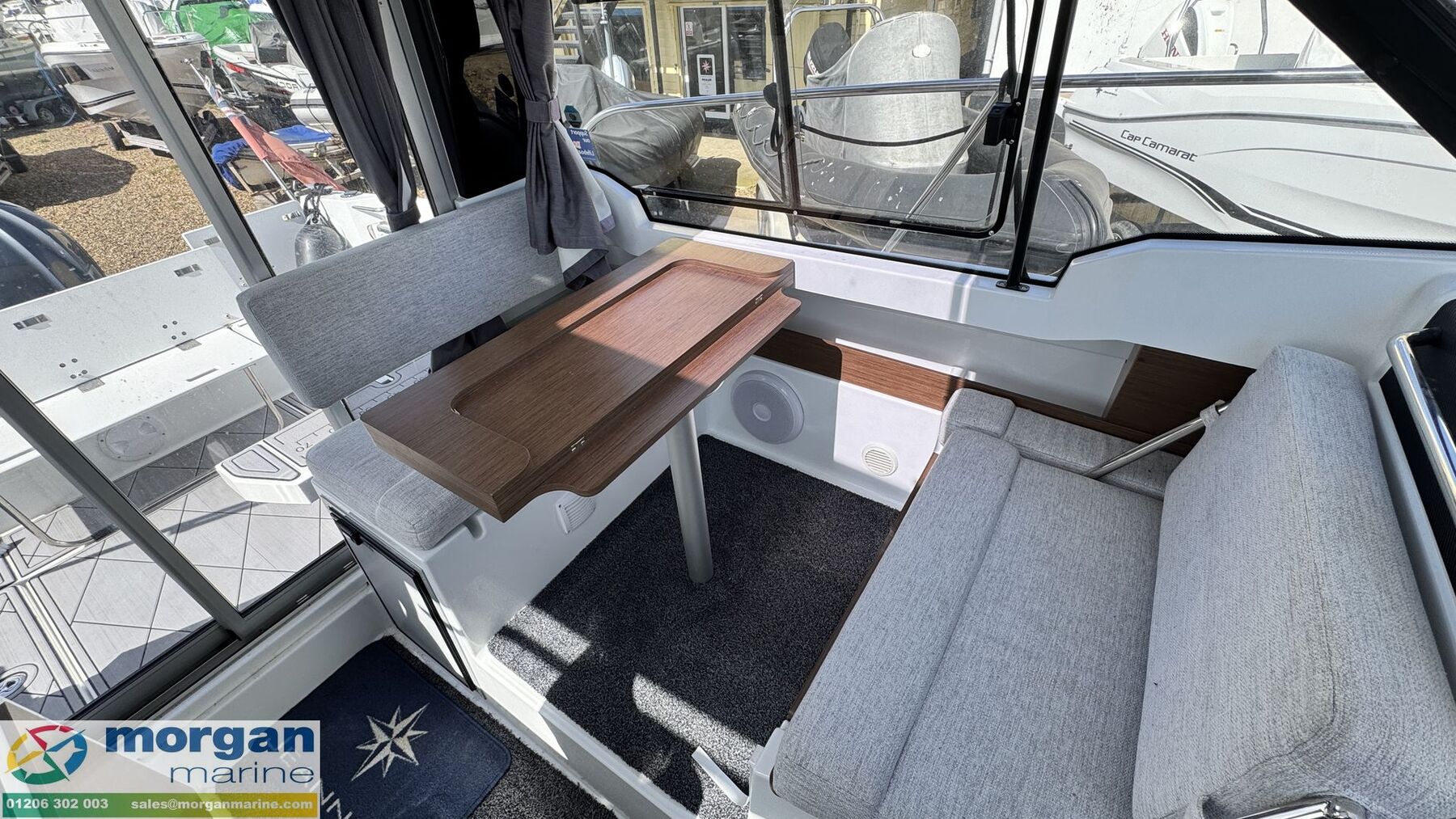 Cockpit: Wheelhouse with aft sliding door, roof hatch and sliding windows on port and starboard sides. Large glass windscreen with port and starboard windscreen wipers + screen wash. Helm position with bolster pilot seat, marine leather steering wheel (£600 option when new), dash with full engine controls, electronics and compass. Original steering wheel spare. Helm seat folds forward for easy access to starboard side luxury galley - with gas stove + gas box, worktop with Arpa black finish, 2x stainless steel glass holders, 40L fridge and sink with electric pressurised hot water. Port side saloon with table with lockers under seats. Forward facing co-pilot bench seat - converts to seating at table. Interior curtains + cabin separation curtain. 2 way blind for sunroof. Stainless Steel marine clock in cockpit. Spare electronics covers.