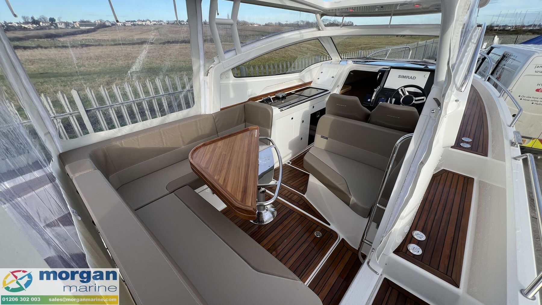 Cockpit: The spacious cockpit blends panoramic visibility with premium comfort. Laminated safety glass and a wide arched windscreen - complete with protection and defroster - ensure excellent sightlines from the helm. Starboard side ergonomic helm and co-pilot seats with bolster, designed for both seated and standing positions. Port side galley, which includes a sink with hot water, fridge and storage + Nimbus crockery & cutlery. Large skylight with blinds in T-top roof.
