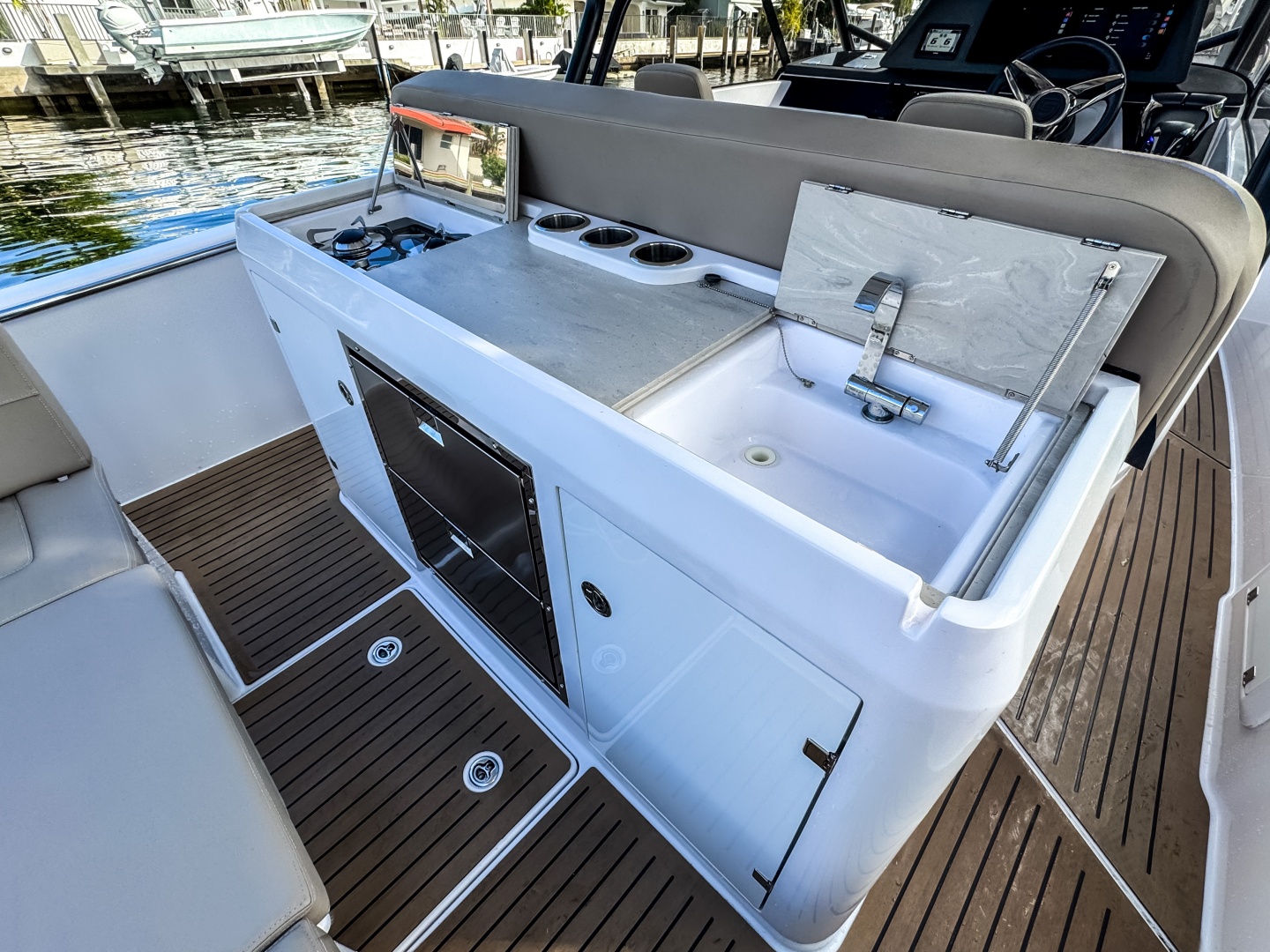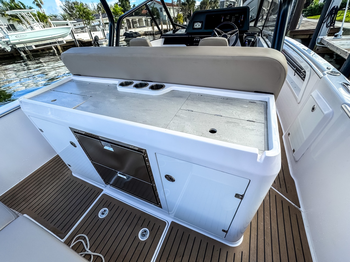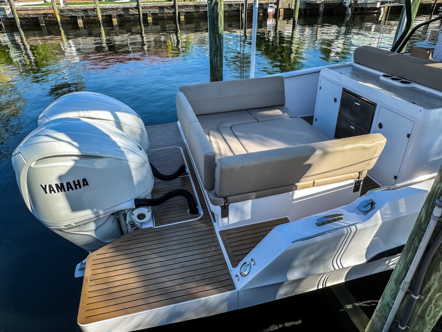 - Large aft platform and generous storage space in lockers under the bar and seating.