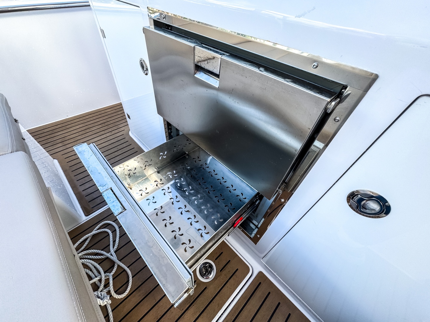 - 85‑liter stainless-steel refrigerator with compressor (in Supersport version) or twin fridge drawers.