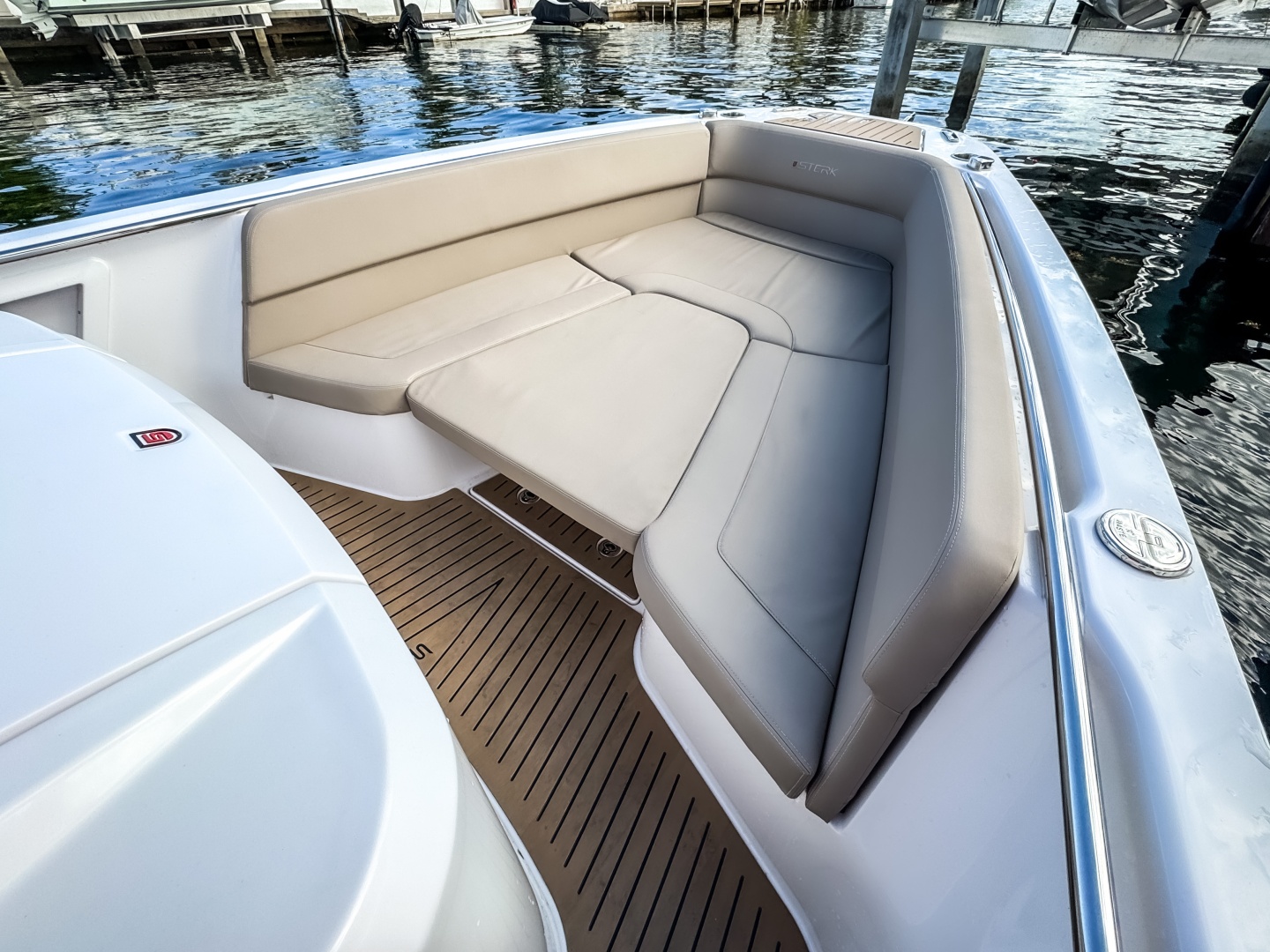 - U-shaped aft bench seat with table that converts into a sun lounger.