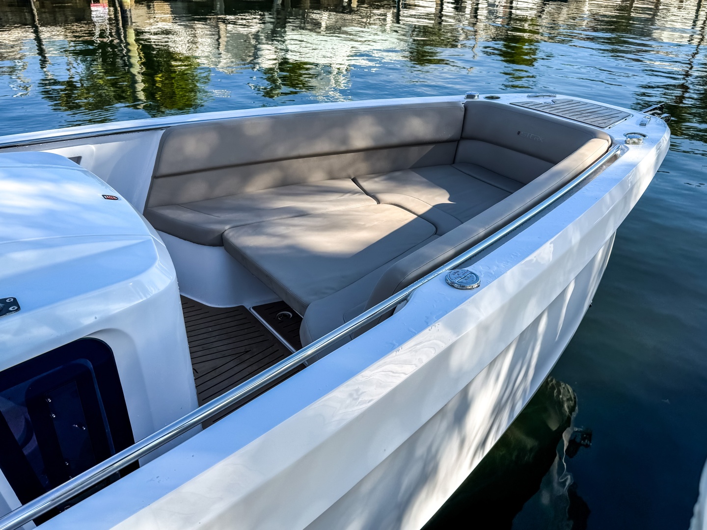 The convertible U-shaped lounge with sunbed transforms the deck into a vibrant social zone—perfect for open-air dining, entertaining, and romantic sunsets. Passenger seats with a leaning function ensure safe, enjoyable cruising. Bow and cabin storage keep everything neatly organized.