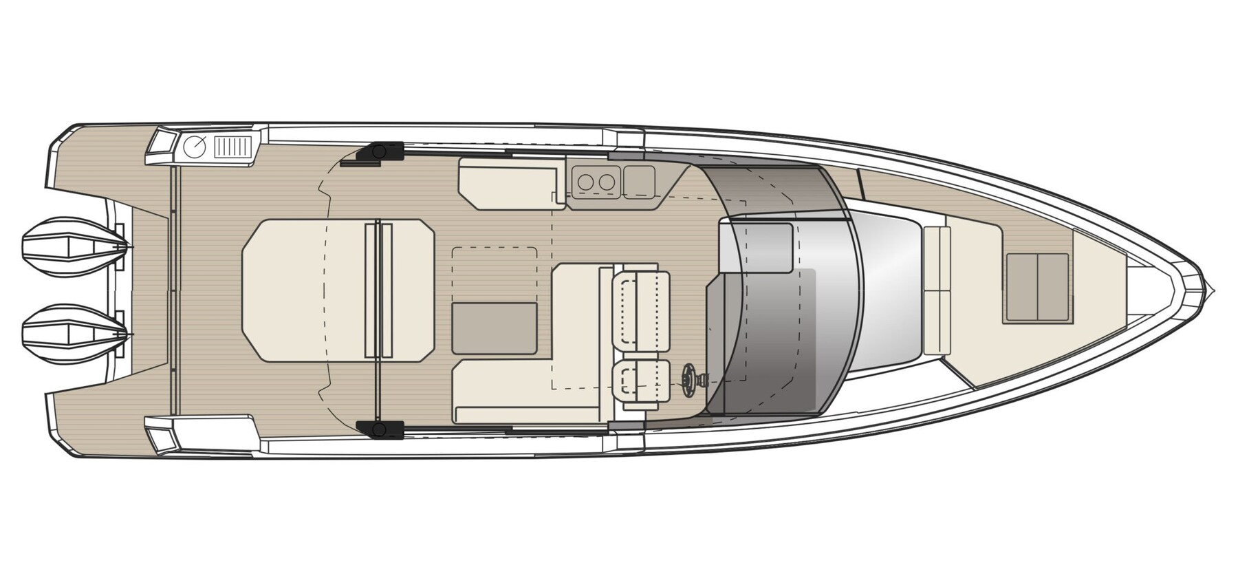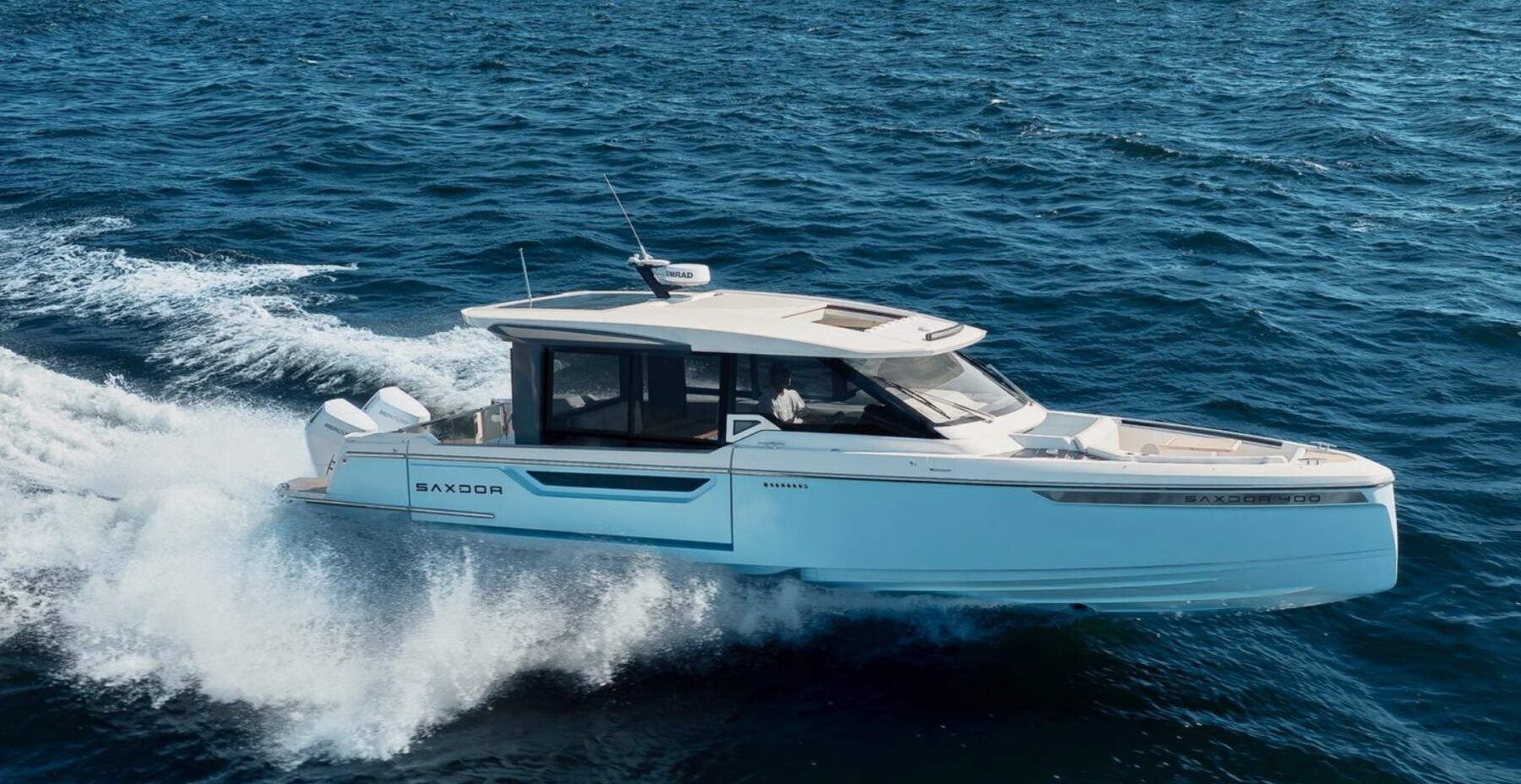 The Saxdor 400 GTC is designed for dual outboard engines and uses an exclusive naval architecture, ensuring a memorable sailing experience. The main deck features an innovative design with a full-width wheelhouse, optimising interior space. Compared to the GTO, the GTC adds a touch of luxury thanks to the large insulated glass surfaces, which create a bright and welcoming environment, protected from the elements. The layout allows for a direct connection to the side terraces, for a relaxation experience similar to a private island. Below deck, two stairs lead to the double cabins – forward and amidships – which share a bathroom; An optional third bed for children is also available. Every detail is designed with elegance and functionality. Contact us for more information.