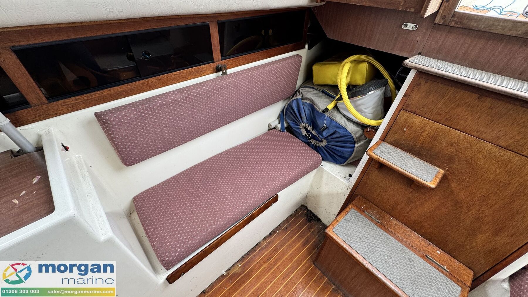 Cabin: Sliding hatch into saloon area. 5 berths. Forward main berth with storage. Port and Starboard single stern berths. Fully galley area with 2 burner grill cooker (brand new - never used), sink with fresh water, and lots of lockers and side lockers. Toilet compartment with Jabsco marine toilet and window. Hatch to deck. Saloon L-shaped cushioned seating. Various cooking and tool sundries. Life Jacket - Expires 2027.